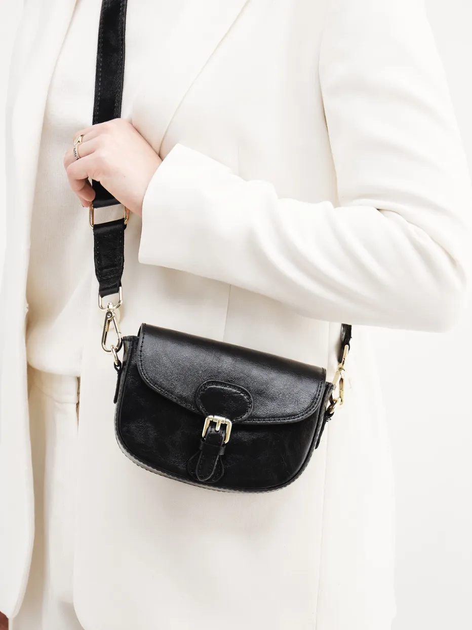 Das kleine Schwarze für Nachtschwärmereien! Mit dieser Minitasche der Marke Marlon Firenze ist man für jede abendliche Veranstaltung bestens ausgestattet. Das Obermaterial aus schwarzem Metallicleder begeistert mit seinem Glanz. Ein Hingucker ist der mit einer eleganten, goldfarbenen Schließe versehene Riemen, unter dem sich ein Druckknopf verbirgt. Ein durchdachtes Detail ist der breite Schulterriemen, der sich auf Wunsch abnehmen lässt und die Tasche somit in eine elegante Clutch verwandelt. Das praktisch geschnittene Innere kann die wichtigsten Ausgehartikel beherbergen. Ein Must-have für festliche Anlässe! – Obermaterial: Metallicleder – Futter: Textil – Farbe: Schwarz – Größe: ca. 13 x 17 x 5 cm (H x B x T) – Schulterriemen: ca. 100 cm, abnehmbar – Verschluss: Druckknopf