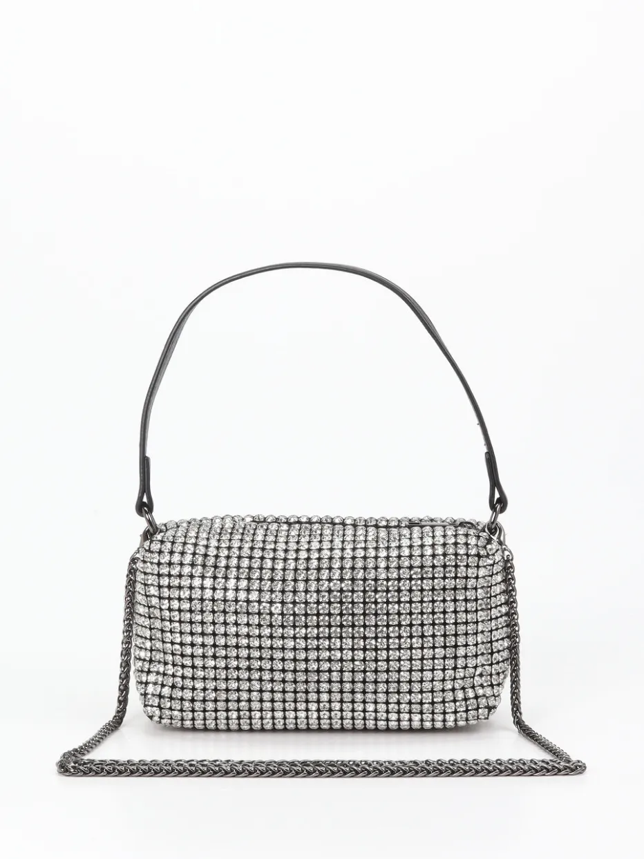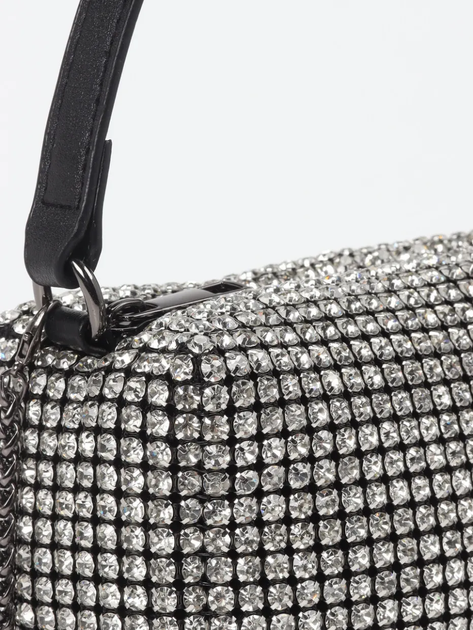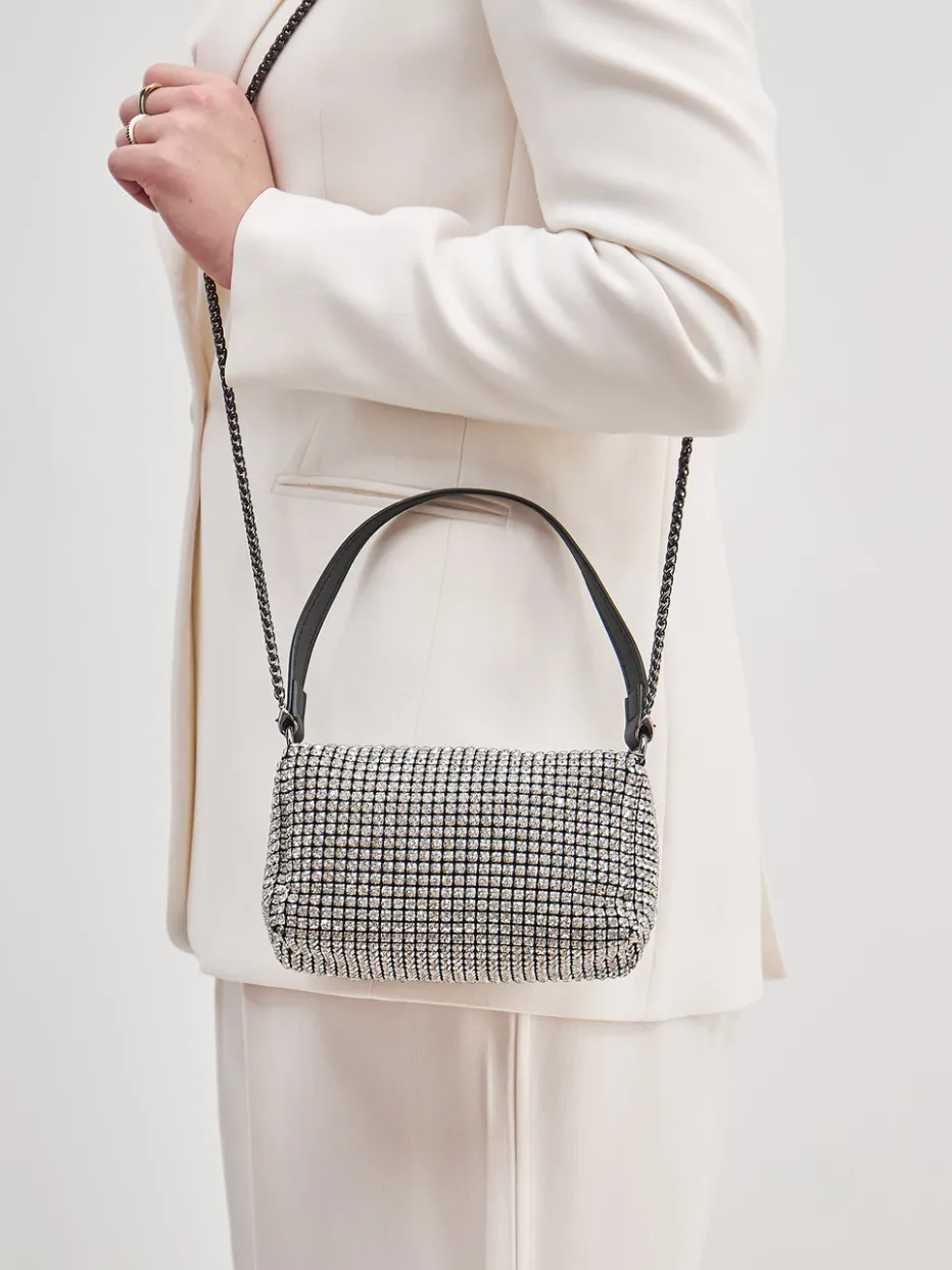 Diese Mini-Umhängetasche vereint glänzendes Metallicleder mit funkelndem Strassbesatz und interpretiert Glamour im Y2K-Stil neu.