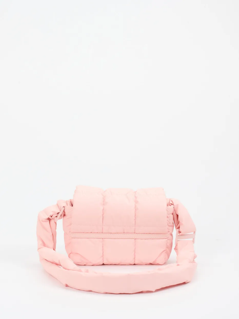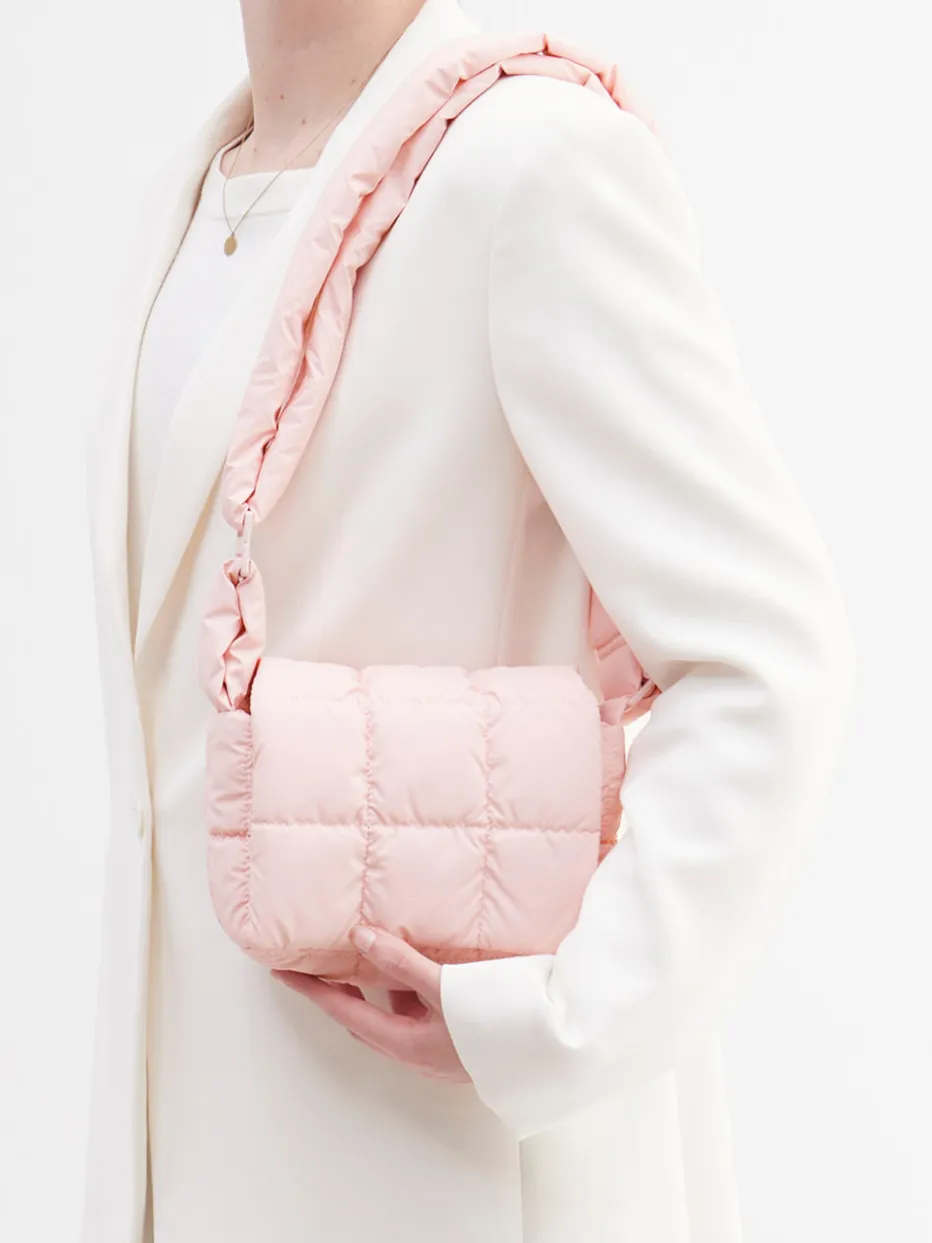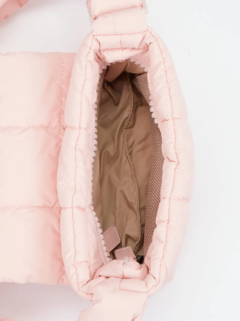 Diese gepolsterte Schultertasche kombiniert urbanen Streetstyle mit nachhaltigem Design. Ihr ultraleichtes, recyceltes Nylon fühlt sich angenehm soft an und glänzt im Trendton Blassrosa.