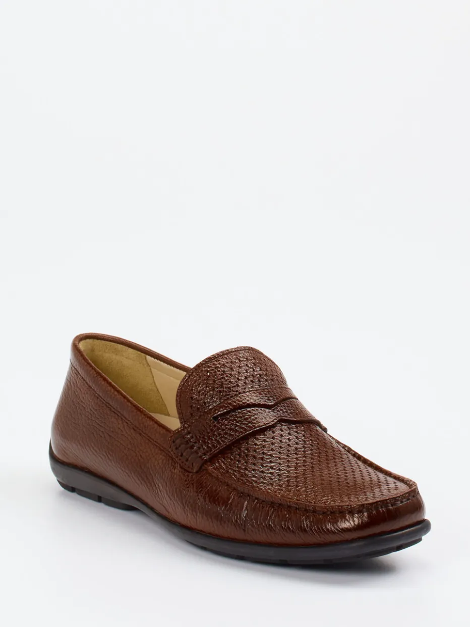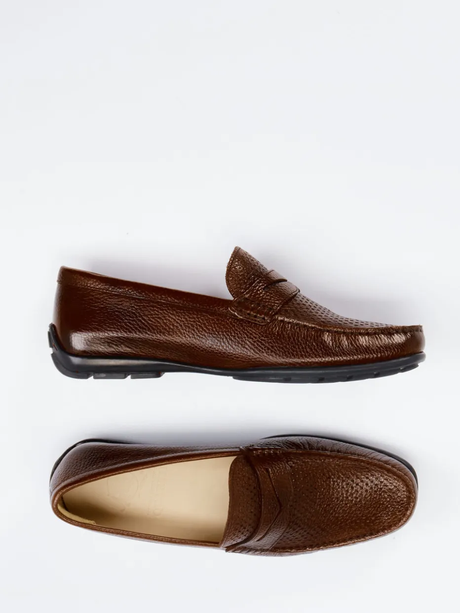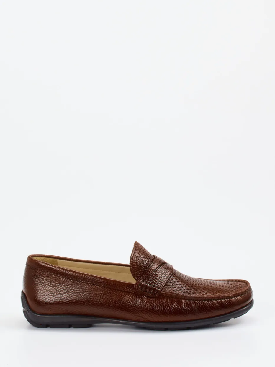 Fein genarbtes Hirschleder, dezente Zierspange und strukturierte Oberfläche machen diesen Mokassin zu einem stilvollen Begleiter zwischen Business und Freizeit.
