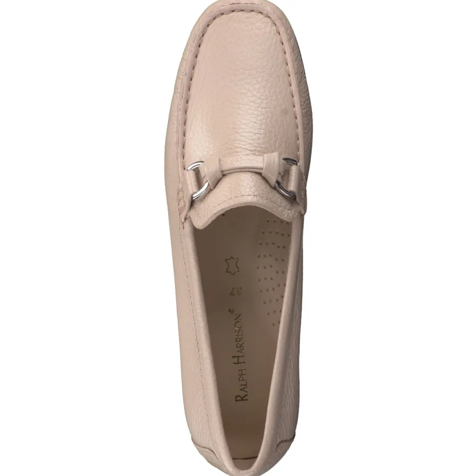 Ungefüttert und weich ist dieser Mokassin der Marke Ralph Harrison. Das nudefarbene, strukturierte Kalbleder wird durch die die tonige Bride mit den silberfarbenen Metallaccessoires feminin geschmückt. Die ausgewogene Carréform verspricht genau wie die von innen gepolsterte, dunkel honigfarbene Gummisohle unkomplizierte Bequemlichkeit.