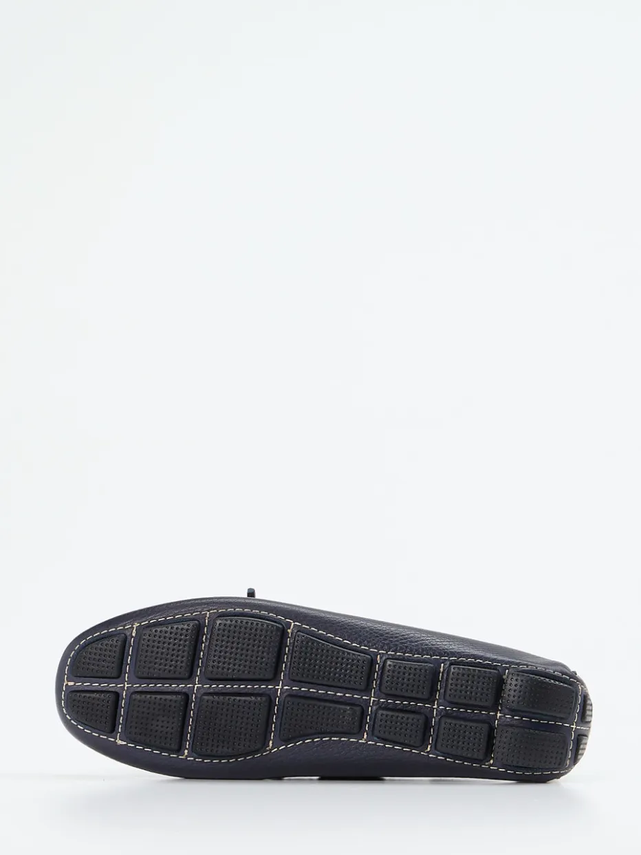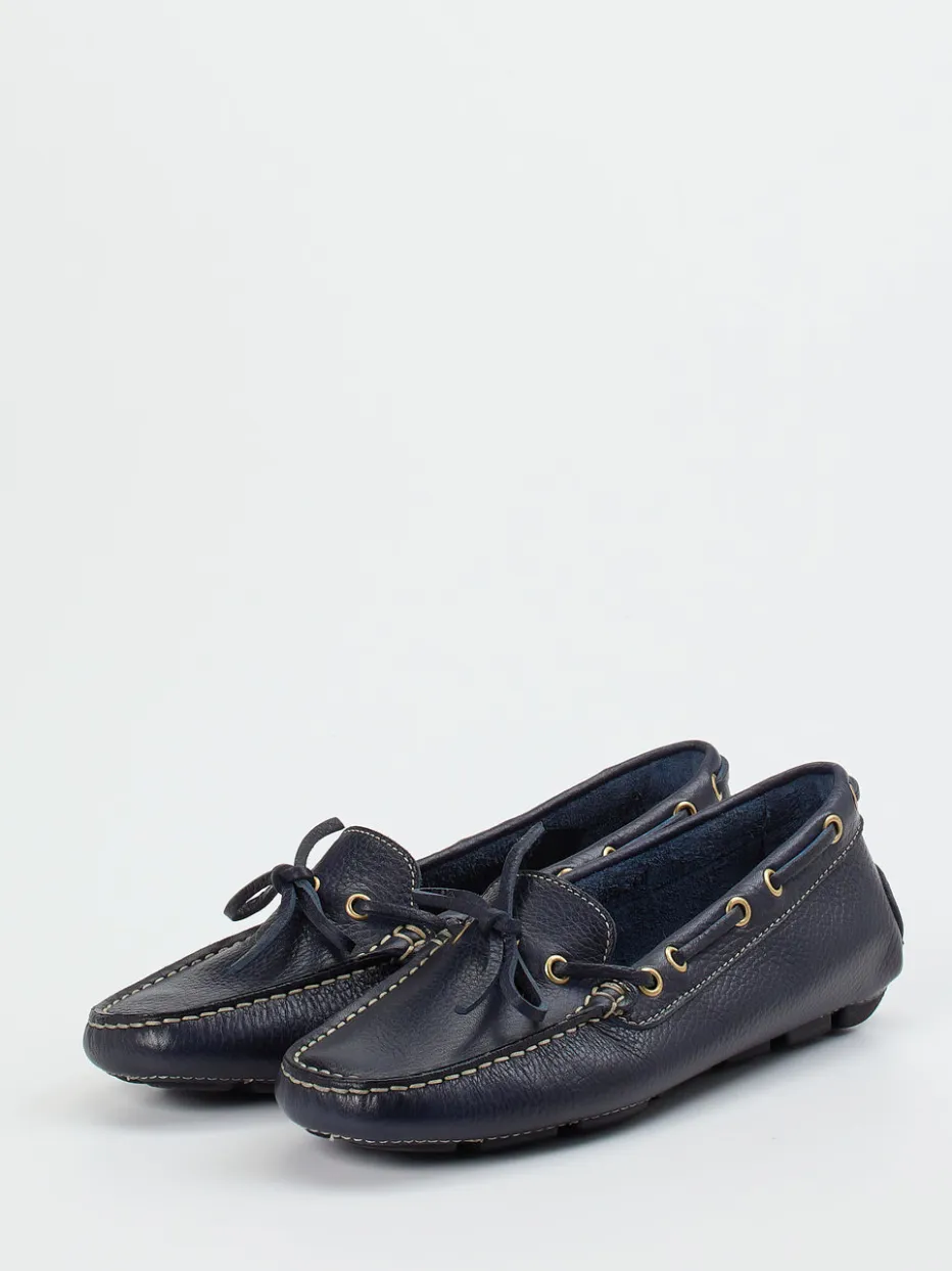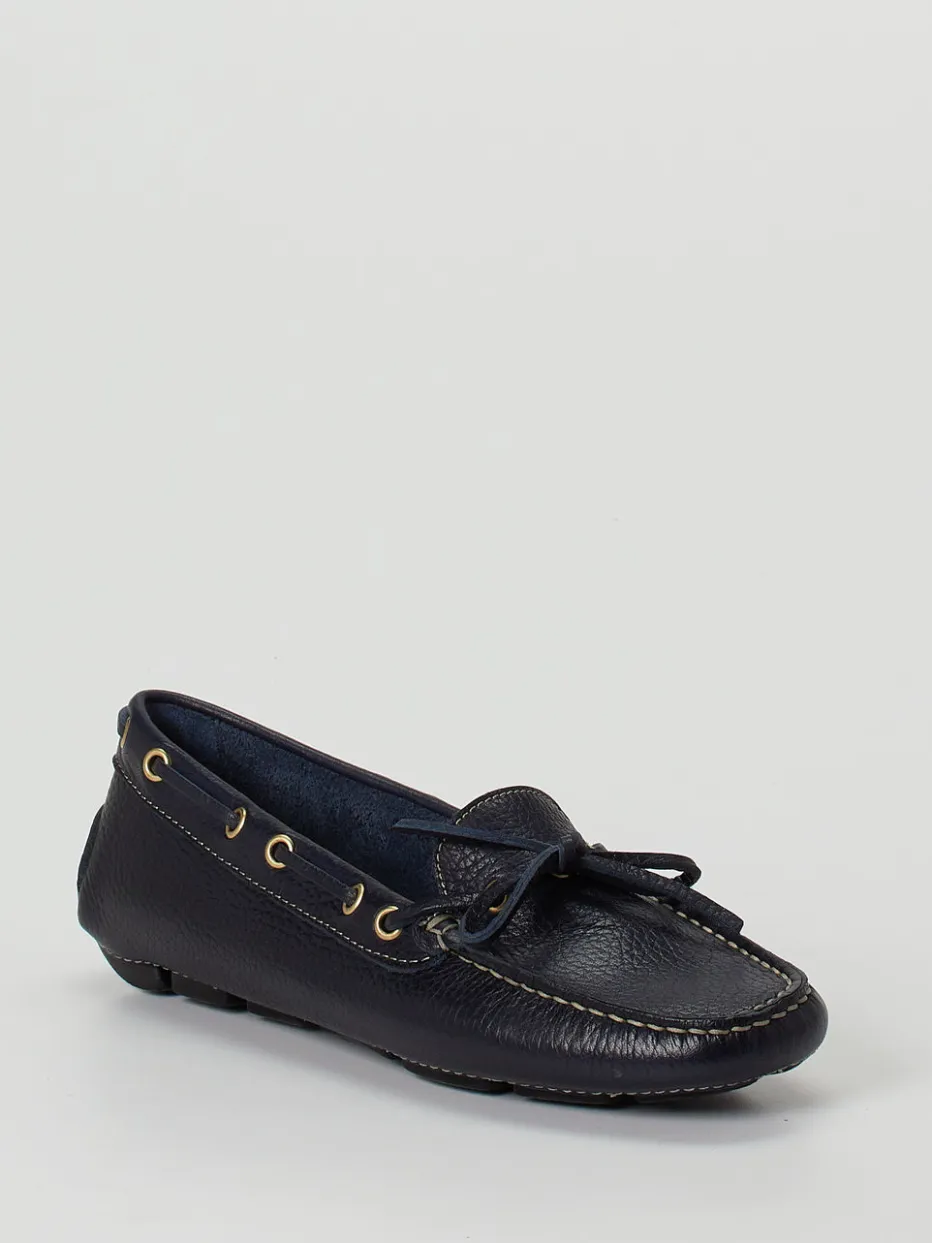 Flexibel, weich und leicht sind die Attribute dieses ledergefütterten Mokassins der Marke Ralph Harrison. Das sportlich genarbte Kalbleder ist dunkelblau. Typisch für den Stil der Bootsschuhe ist der umlaufende Senkel. Die großen, goldfarbenen Ösen schmücken und geben Glanz. Die Sohle ist an der Ferse hochgezogen und besteht aus schwarzen Gummikassetten. Mit diesem Mokassin finden Sie ein unkompliziertes Accessoire für sommerliche Tage.