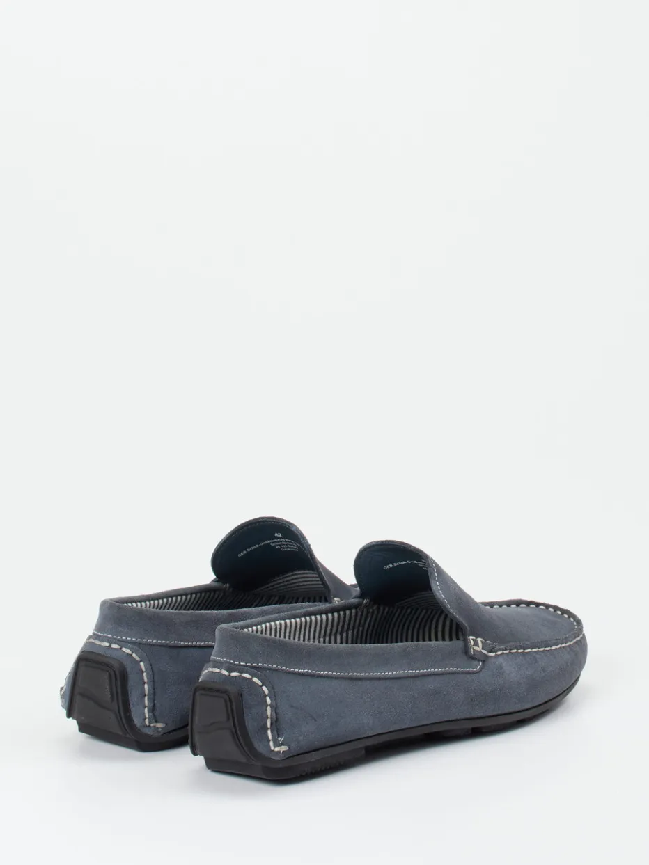 Ein Mokassin mit klassischer Silhouette, gefertigt aus hochwertigem Veloursleder. Die blaugraue Farbgebung und weiße Kontrastnähte sorgen für zeitlose Eleganz mit modernem Twist.