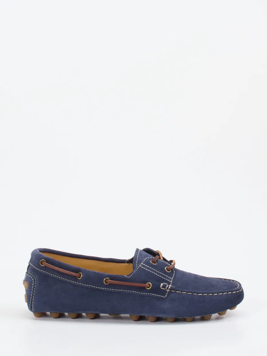 Für den Spaziergang entlang der Promenade oder den gehobenen Casual-Look bietet das Modell Komfort und Stil: Gefertigt aus marineblauem Veloursleder mit samtig-weicher Oberfläche, zeigt der Schuh charakteristische Kontrastnähte in Beige und eine braune Zierschnürung. Die flache, gerundete Silhouette schmeichelt dem Fuß, während die honigfarbene Noppensohle für sicheren Tritt und Markenerkennung sorgt. Das strapazierfähige Kalblederfutter erhöht den Tragekomfort – optimal für sommerliche Freizeit-Aktivitäten. Stilistisch passt er hervorragend zu Chinos und leichten Baumwollhemden.