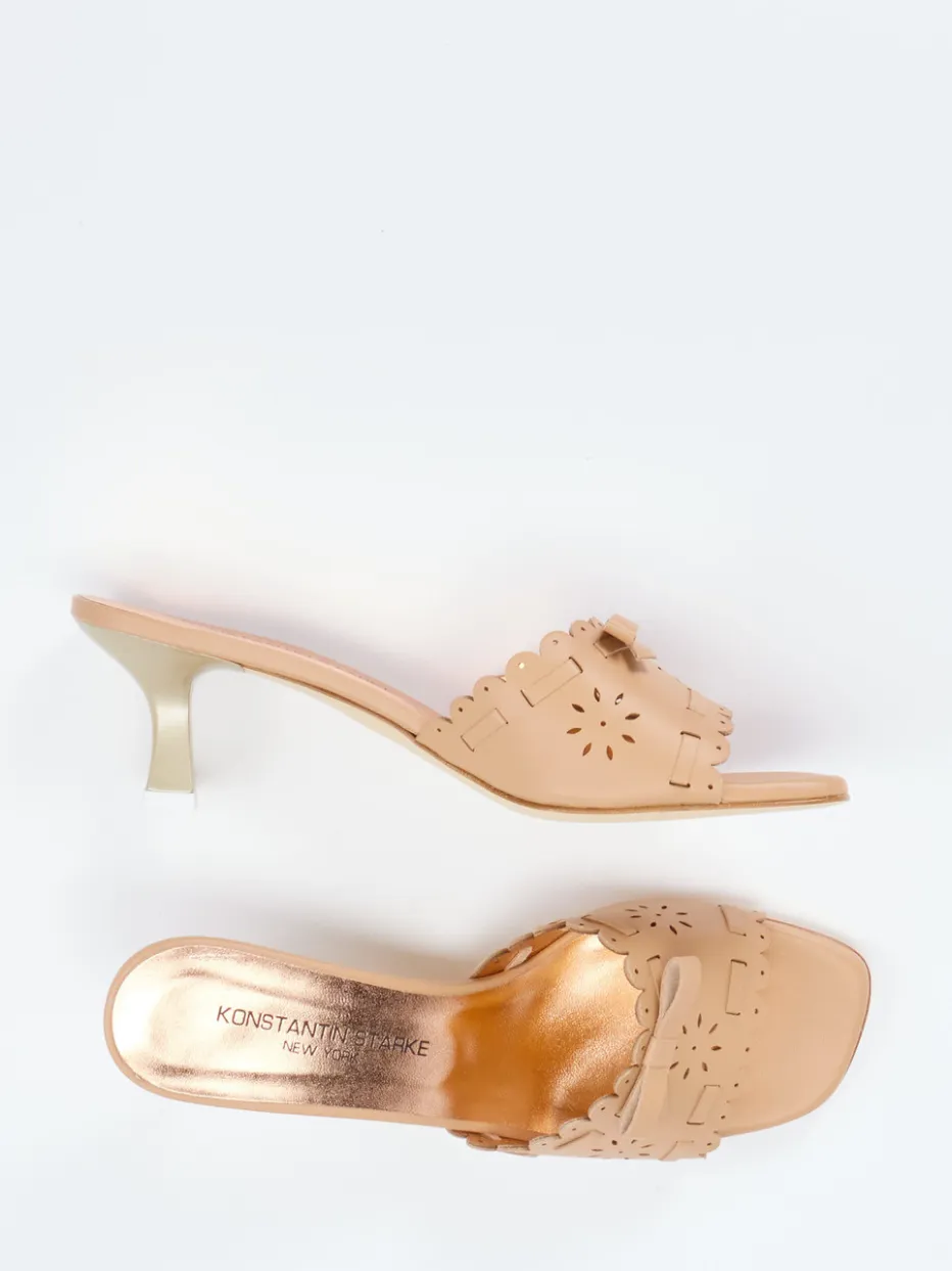 Sommerliche Eleganz mit floraler Raffinesse.Konstantin Starke präsentiert stilvolle Damen-Mules in hochwertigem Kalbleder. Ideal für stilvolle Alltagsmomente oder sommerliche Events: Das beigefarbene, matt gehaltene Leder mit floraler Lasercut-Optik und dekorativer Schleife bringt romantischen Charme in den Look. Innen glänzt ein roségoldenes, leicht gepolstertes Futter, das nicht nur Komfort, sondern auch eine edle Note verleiht. Die schlank zulaufende Silhouette wird durch den femininen Kitten Heel ergänzt, der ein angenehmes Tragegefühl bietet. Ein Modell mit Vintage-Flair, passend zum „Quiet Luxury“-Trend. Stimmige Formensprache trifft auf handwerkliche Detailverliebtheit – Konstantin Starke pur.
