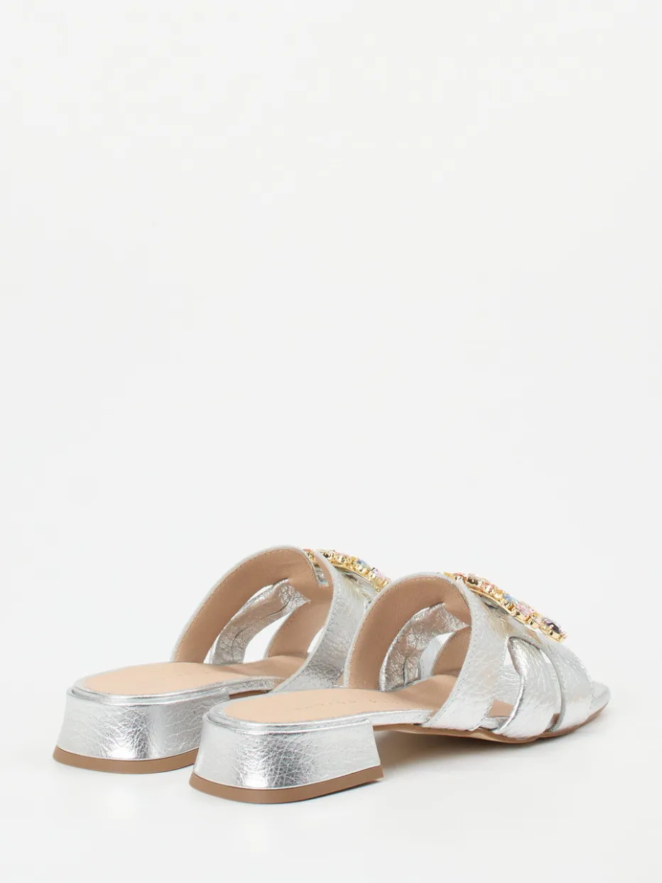 Glamour in seiner modernsten Form: Diese Mules verbinden Metallicleder mit farbiger Strassverzierung und bringen festliche Eleganz in modische Balance. Ideal für stilvolle Auftritte am Abend.