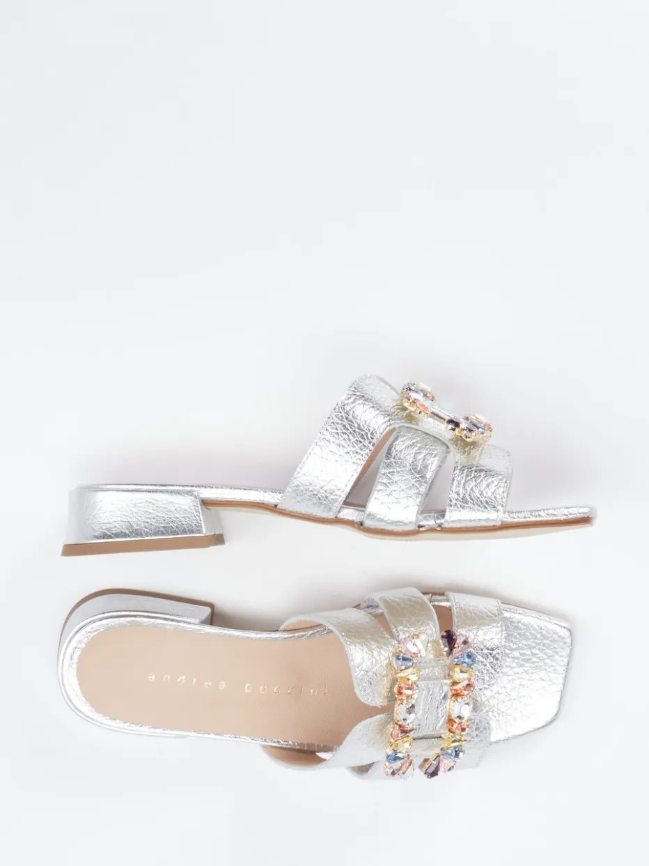 Glanzvoller Akzent für elegante Anlässe.Andrea Puccini interpretiert die klassische Pantolette neu – als elegante Mules für Damen. Wenn der Look nach Extravaganz verlangt, überzeugt dieses Modell mit seiner silbernen Optik und einem erlesen genarbten Metallicleder, das durch eine multicolore Schmuckverzierung mit goldfarbener Fassung ergänzt wird. Die offene, geradlinige Silhouette mit rechteckiger Zehenpartie und komfortablem Blockabsatz steht für stilbewusste Weiblichkeit. Die Gummisohle garantiert solide Trittsicherheit. Im Kontext aktueller Metallic- und Ornamentiktrends ist dieses Paar ein modisches Statement für festliche Events oder exklusive Abendveranstaltungen. Ein hochwertiger Style mit modischer Strahlkraft – typisch Andrea Puccini.