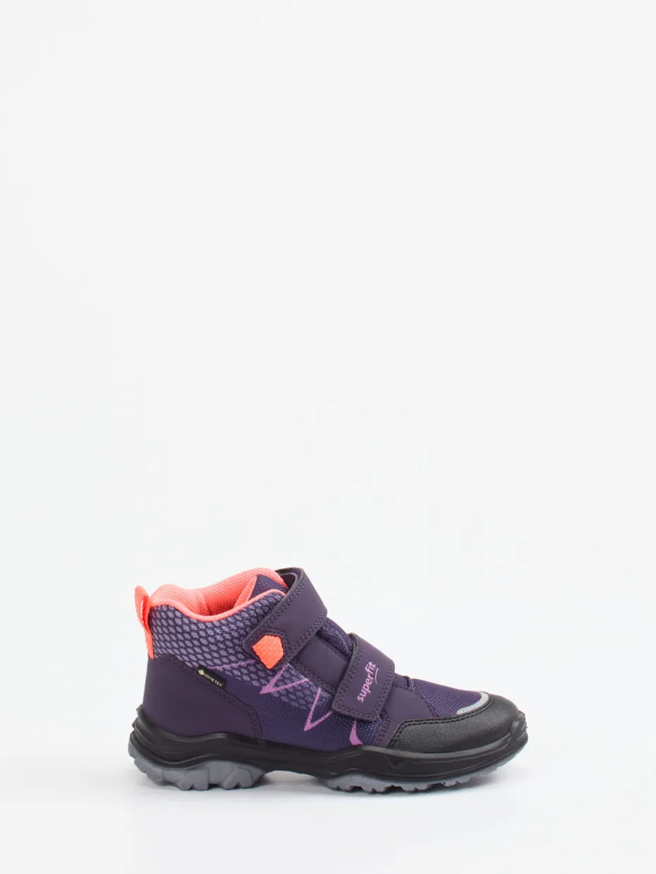 Bereit für große Abenteuer.Die Marke Superfit präsentiert robuste Outdoor-Boots für Kinder. Ideal für Spaziergänge im Regen oder Entdeckungstouren im Park: Das knöchelhohe Modell aus Synthetik mit matter Mesh-Struktur bietet durch die integrierte GORE-TEX®-Membran zuverlässigen Schutz vor Nässe. Die Kombination aus intensiver Dunkellila-Grundfarbe und auffälligen Koralle-Akzenten sorgt für einen frischen Color-Blocking-Look, unterstützt von reflektierenden Details und Logo-Print auf dem Klettverschluss. Die tief profilierte PU-Sohle fördert sicheren Halt auf unebenem Untergrund. Praktische Zuglasche und doppelte Klettverschlüsse erlauben eigenständiges Anziehen. Perfekt für Kinder, die Funktion und Komfort sportlich tragen wollen.