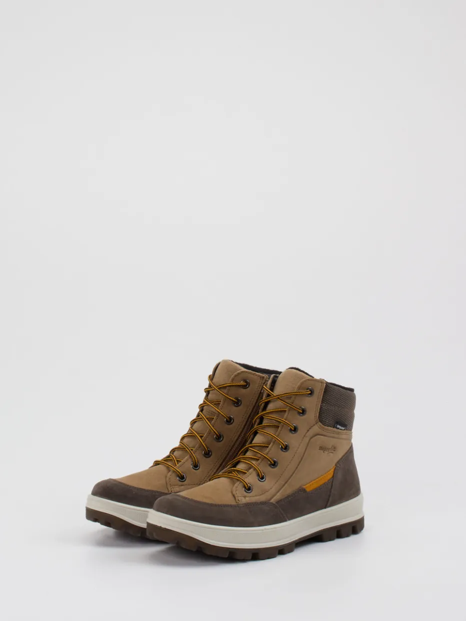 Gorpcore trifft kindgerechten Komfort.Superfit bietet mit diesen knöchelhohen Outdoor-Boots ein herbstbereites Modell für aktive Kinder. Durch wasserabweisendes Veloursleder mit samtiger Haptik und warmes Textilfutter entsteht ein idealer Begleiter für Alltag und Ausflüge bei kühleren Temperaturen. Das sandbraune Obermaterial wird durch dunkelbraune und senfgelbe Akzente hervorgehoben. Praktische Komponenten wie die Kombination aus Schnürung und seitlichem Reißverschluss erleichtern das Anziehen, während die profilierte PU-Sohle Trittsicherheit auf unebenem Terrain gibt. Der Look orientiert sich am Gorpcore-Trend und passt zu Thermo-Leggings oder Outdoorjacken. Ein durchdachtes Kinderschuhmodell mit funktionaler Optik und langlebiger Machart.