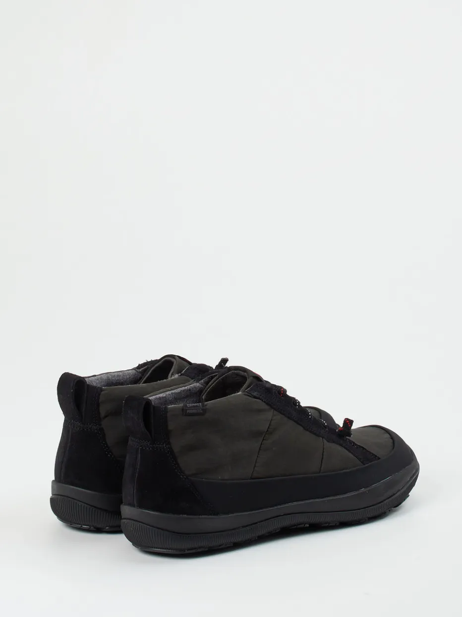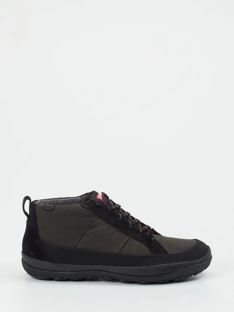 Robust trifft auf urbanes Design.Camper präsentiert mit diesem halbhohen Outdoor-Sneaker ein komfortorientiertes Schuhwerk für alle, die stilvoll unterwegs sein möchten. Der Materialmix aus wasserabweisendem Textil und samtig angeschliffenem Wildleder kombiniert mit einem gepolsterten Schaft und Mesh-Innenfutter bietet idealen Schutz bei wechselhaftem Wetter. Die dominante Farbe in Dunkelgrau mit roten Akzenten, die zweifarbige Schnürung und reflektierende Details unterstreichen den funktionalen Streetwear-Stil. Besonderes Highlight ist die profilierte Michelin-Gummisohle, die erhöhte Traktion auf urbanem Terrain bietet. Lässt sich hervorragend mit lässigen Outfits und Outdoor-Wear kombinieren. Komfort und Stil in kompromissloser Camper-Qualität.