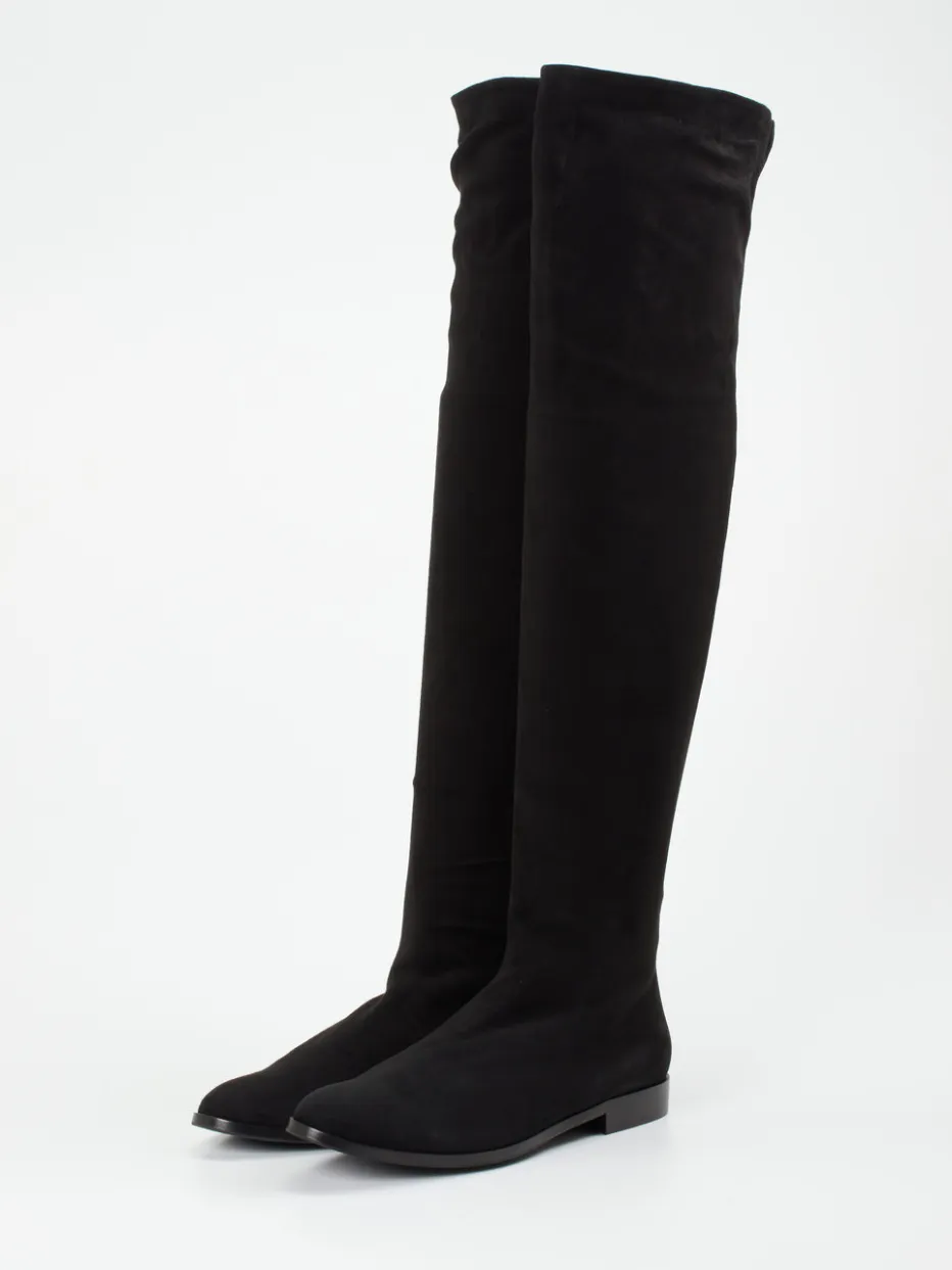 Ein Overknee-Stiefel wie aus einem Guss: Veloursleder, flacher Absatz und schmale Silhouette vereinen Formgefühl und Minimalismus auf inspirierende Weise.