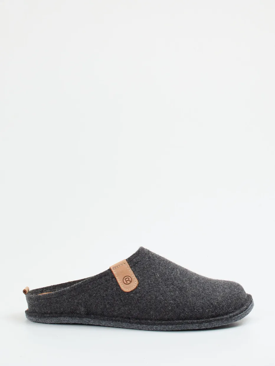 Minimalismus trifft Wohlgefühl.Die Marke Rohde interpretiert mit diesen Pantoffeln den klassischen Hausschuh neu. Für entspannte Momente daheim bietet das Modell wohlig warmen Tragekomfort mit einem ergonomisch geformten, lederbezogenen Fußbett. Gefertigt aus recyceltem Softfilz in anthrazitgrauer Farbgebung und akzentuiert durch ein hellbraunes Leder-Label mit Logoprägung, fügen sich die Pantoffeln nahtlos in minimalistische Loungewear-Looks ein. Die offene Ferse sorgt für schnelles Hineinschlüpfen, während die gummierte Sohle mit Filzbeschichtung Trittsicherheit verleiht. Inspiriert vom skandinavischen Wohnstil, passt das dezente Design ebenso zu Baumwoll-Hausanzügen wie zu kuschligen Wollsocken. Rohde verbindet Komfortästhetik mit Alltagstauglichkeit auf hohem Niveau.