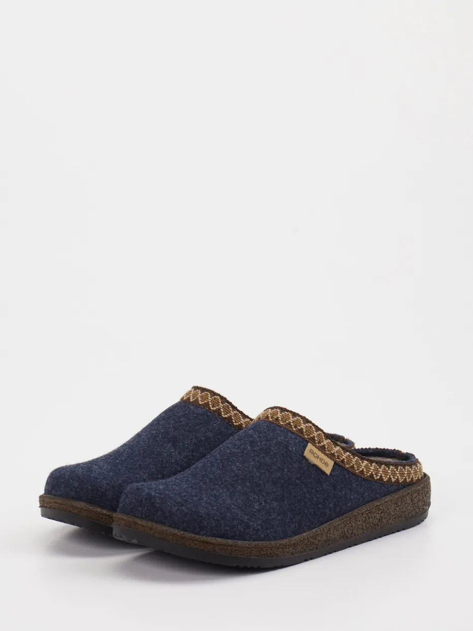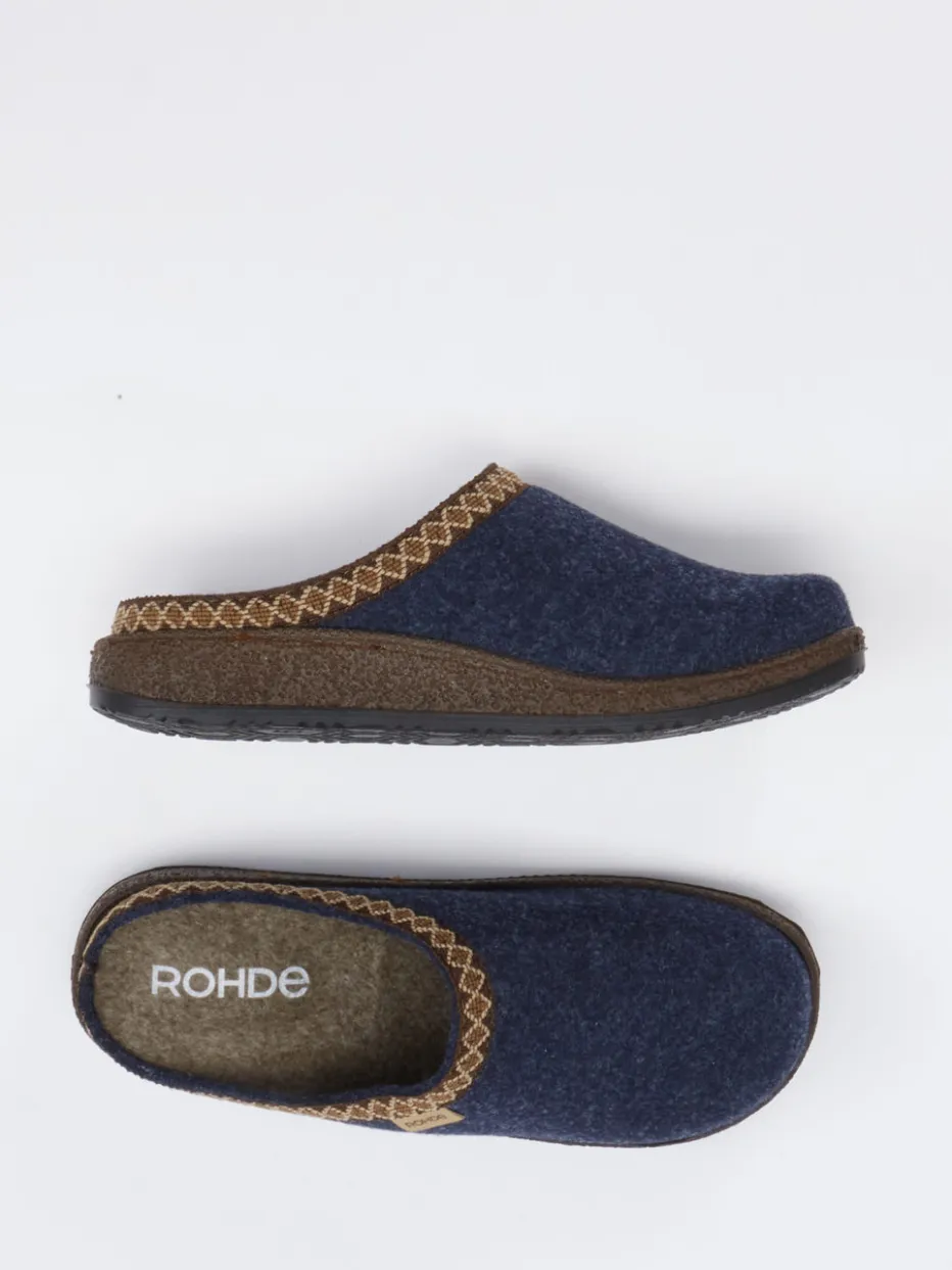 Gemütlichkeit mit alpinem Akzent. Rohde präsentiert diese geschlossenen Pantoffeln aus softem Filz für Damen. Für ruhige Momente daheim bietet dieser Hausschuh eine rundum komfortable Lösung: Das filzartige Obermaterial in tiefem Dunkelblau wird durch eine kontrastierende Zierborte in Rautenoptik akzentuiert. Die offene Fersenpartie erleichtert das Reinschlüpfen, während die ergonomische Form Halt bietet. Die rutschhemmende Gummisohle sorgt für Sicherheit auf glatten Böden. Inspiriert von alpiner Schlichtheit und slow living ist dieses Modell perfekt für modesensible Rückzugsorte. Kombiniert mit Wollsocken oder Fleecewear entsteht ein stimmiger Look. Sanfter Tragekomfort mit funktionalem Design – typisch Rohde.