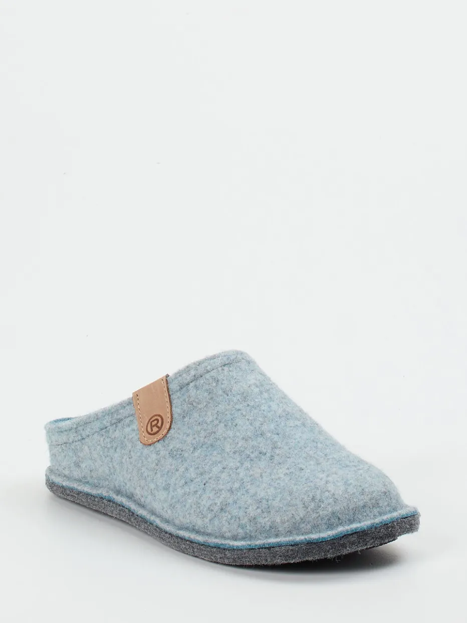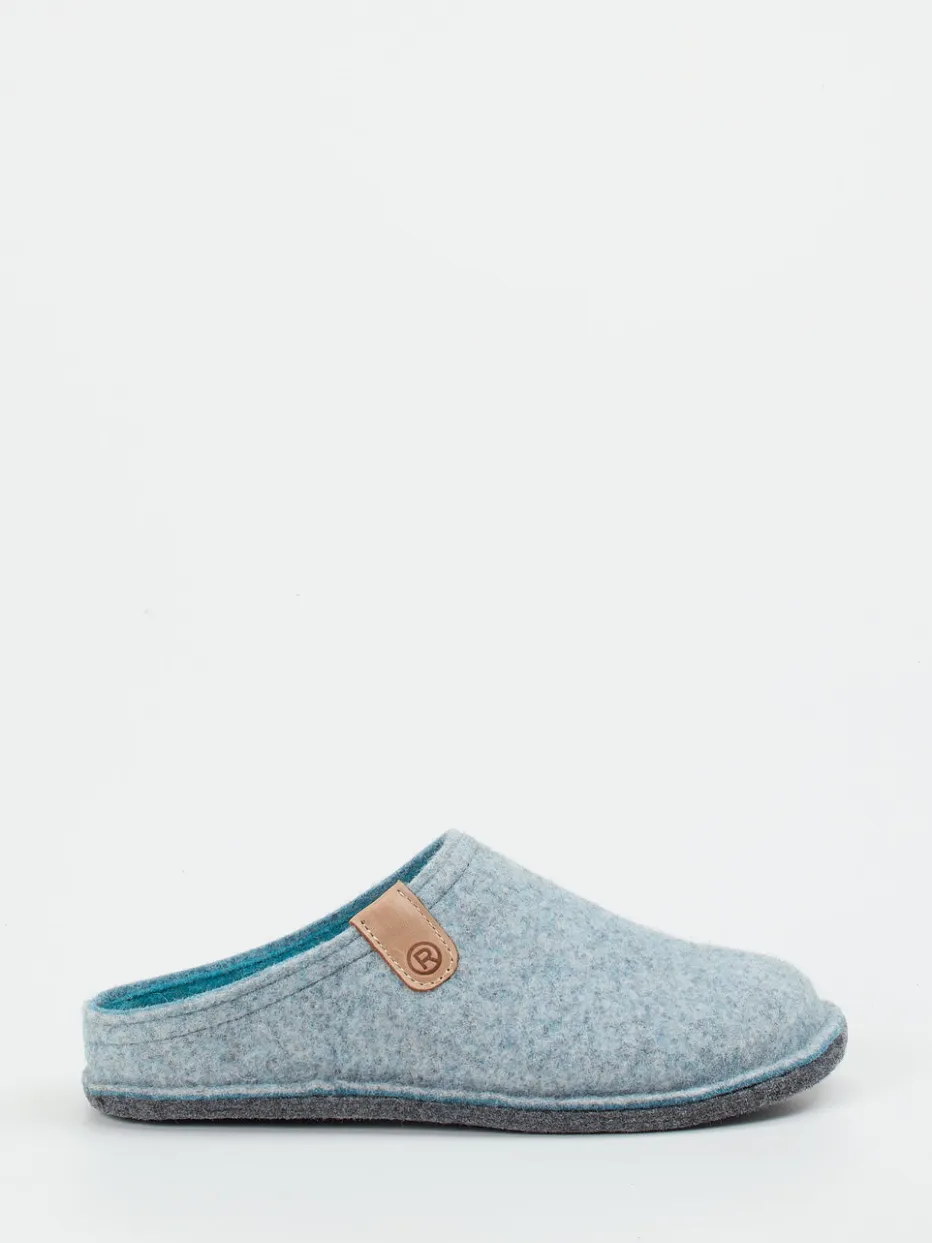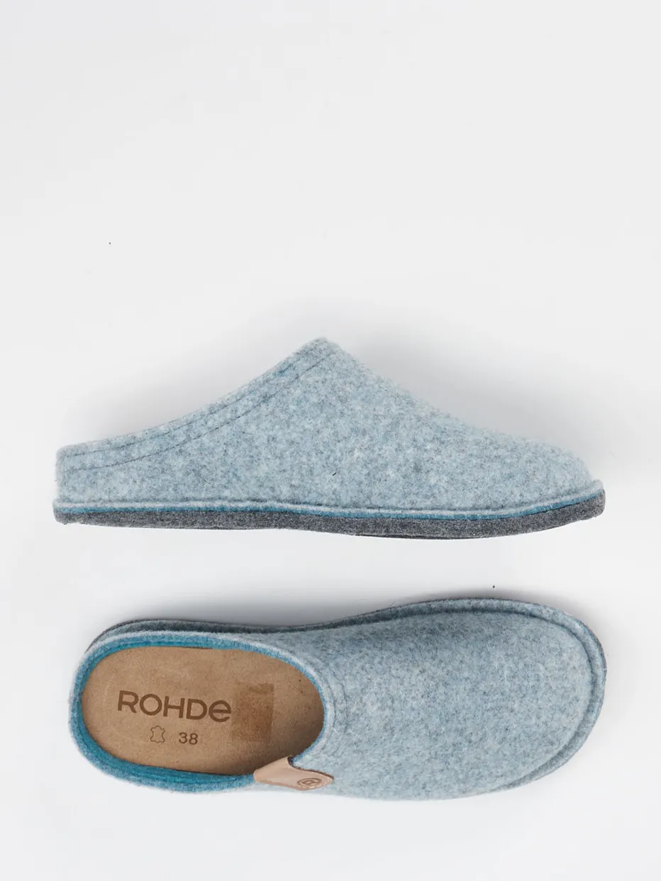 Skandinavisch inspiriert, bequem verankert.Die Marke Rohde präsentiert komfortable Pantoffeln für den Alltag zu Hause. Warme Füße beim entspannten Lesen auf dem Sofa oder beim Gang zur Küche: Der aus strukturiertem Filz gefertigte Hausschuh überzeugt durch sein luftiges Tragegefühl und das hellblaue Melange-Design. Der offene Fersenbereich ermöglicht einfaches Hineinschlüpfen, während ein farblich akzentuiertes Naturleder-Patch mit Logo sowie eine rutschhemmende Gummisohle durchdachte Details setzen. Die minimalistische Formsprache trifft den skandinavischen Stil und passt zur aktuellen „Natural Comfort“-Tendenz. Besonders harmonisch in Kombination mit Wollsocken. Komfortable Ästhetik von Rohde – reduziert auf das Wesentliche.