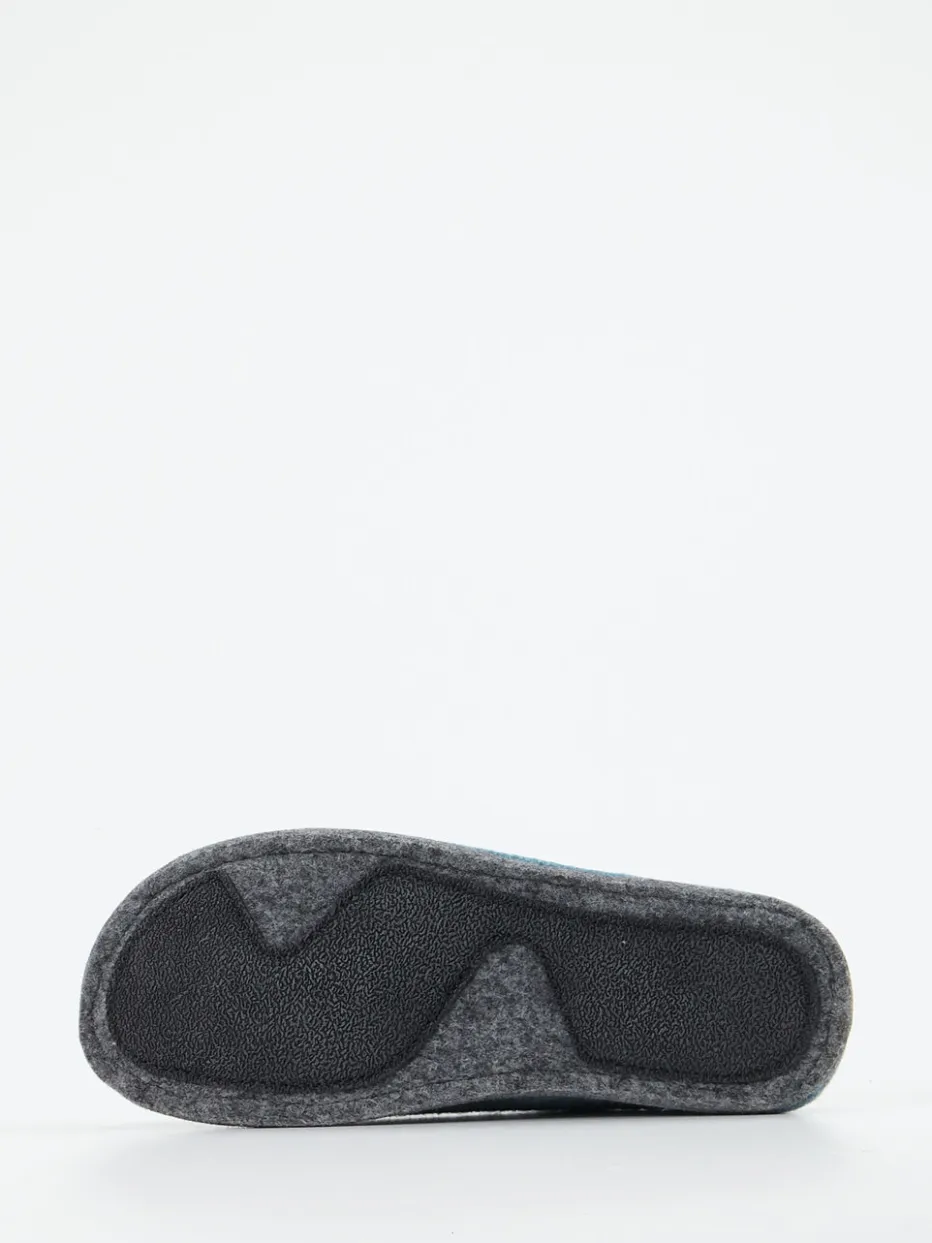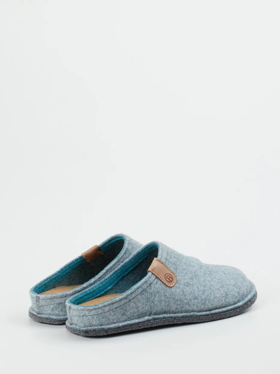 Der hochwertige Filz in Hellblau-Melange und das raffinierte Lederdetail machen diesen Pantoffel zu einer stilvollen wie funktionalen Wahl für entspannte Stunden daheim.