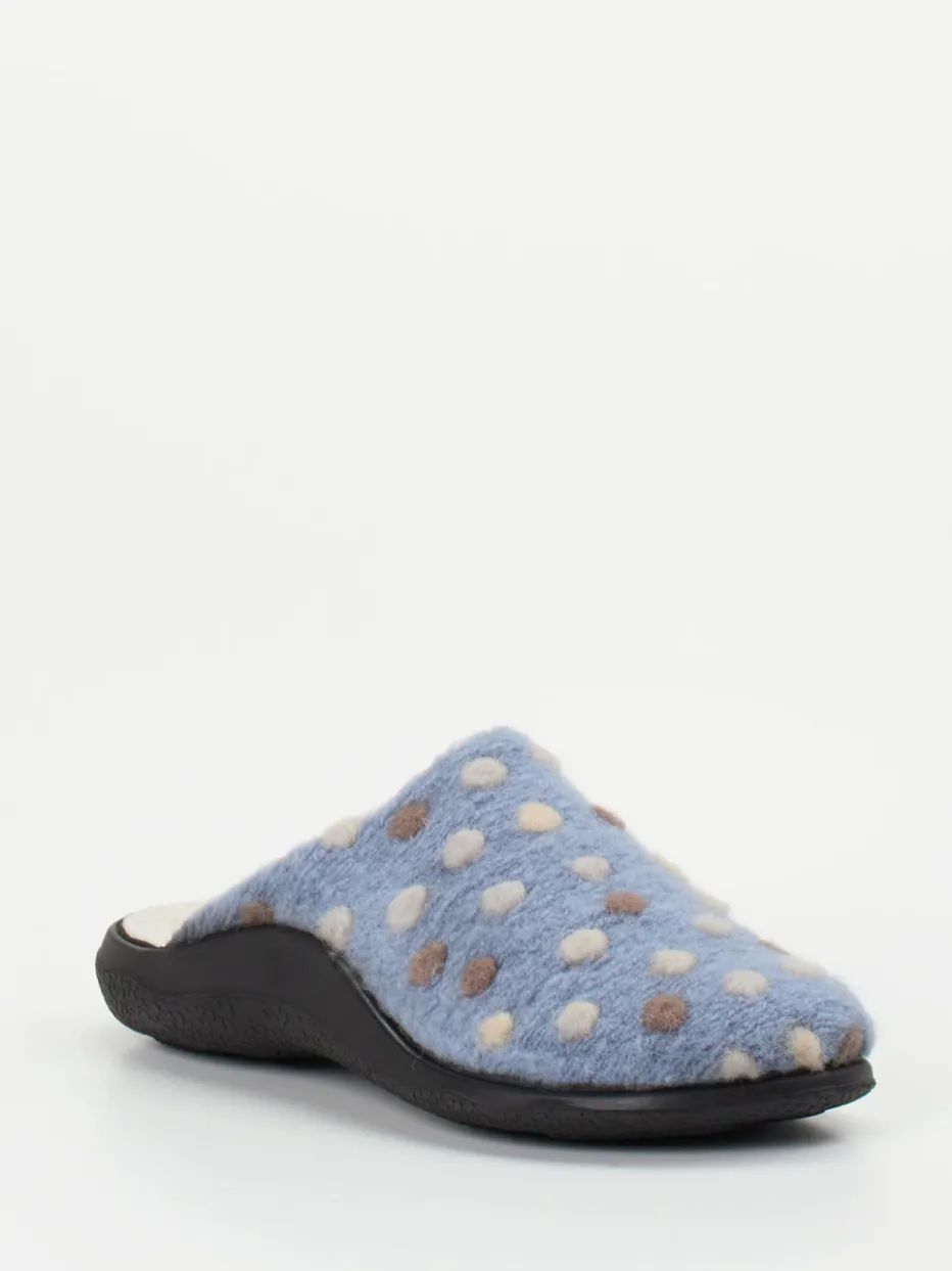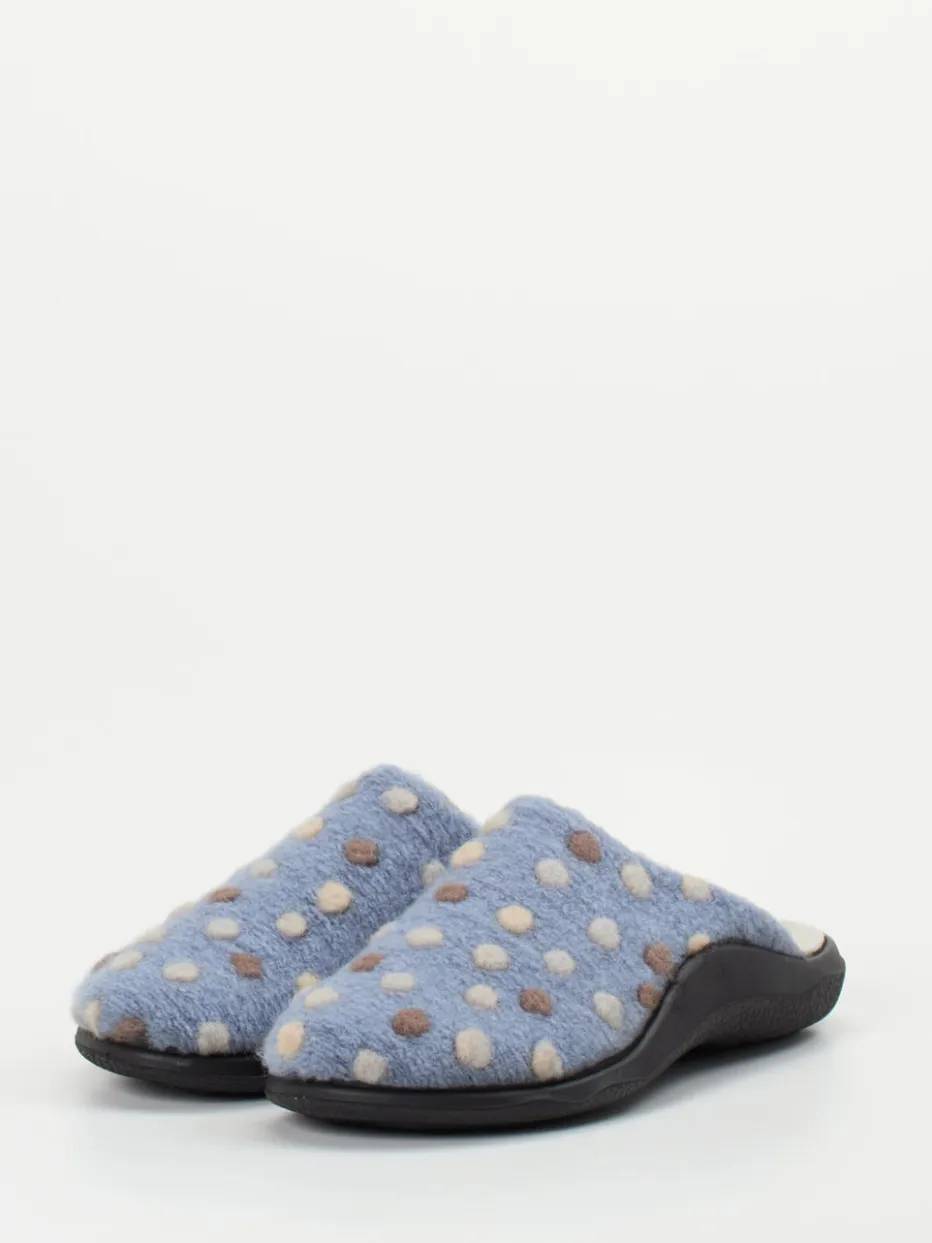 Das flauschige Filzmaterial mit mehrfarbigen Punktapplikationen bietet nicht nur eine wohnliche Haptik, sondern auch ein winterlich-gemütliches Erscheinungsbild. Ergonomisch geformt und mit flauschigem Innenfutter versehen, sorgt das Modell für ein angenehm wärmendes Fußklima. Die abriebbeständige PU-Sohle mit rutschhemmendem Profil gewährleistet sicheren Halt auf glatten Böden. Ideal kombinierbar mit Kuschelsocken oder Hauskleidung im Hygge-Stil.