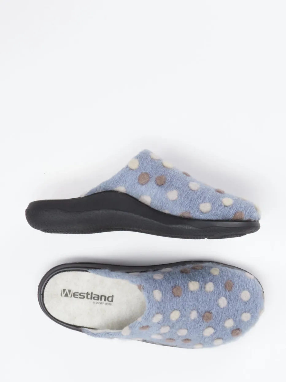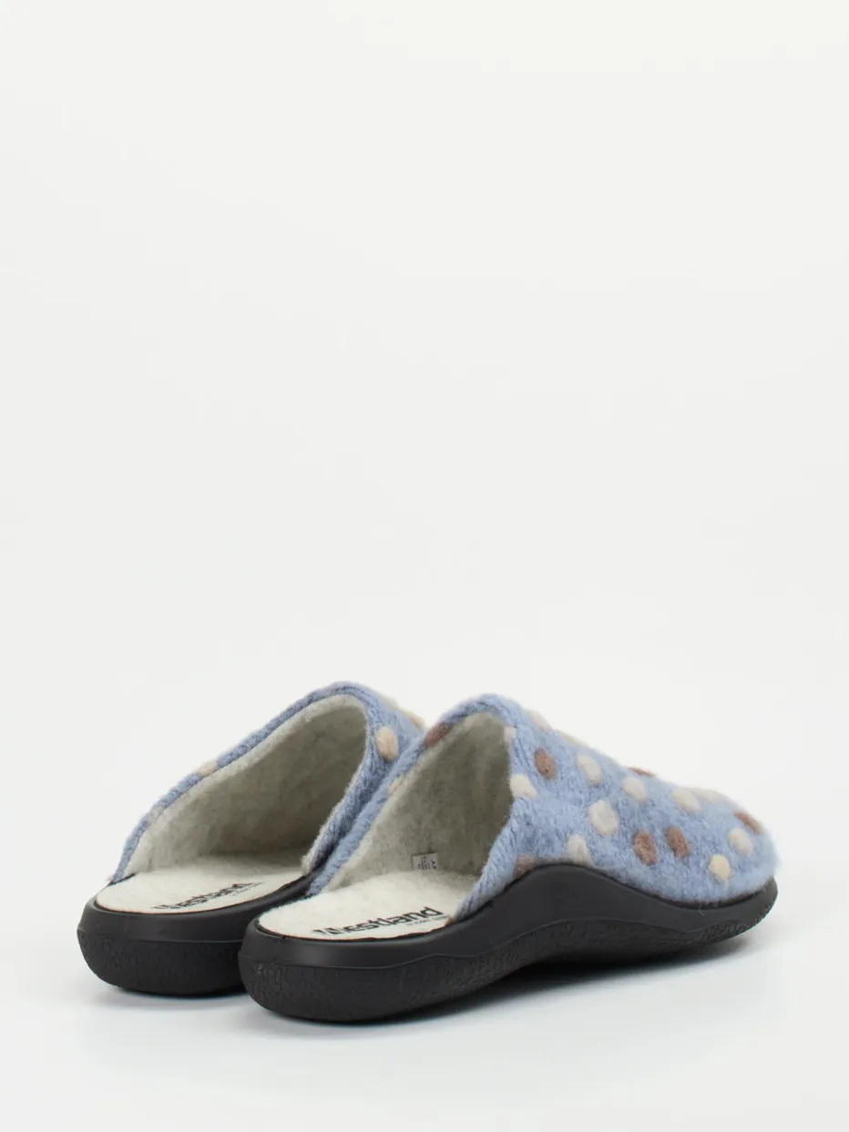 Westland präsentiert Damenpantoffeln aus hochwertigem Wollfilz in hellblauem Ton. Die geschlossene Pantoffelform mit offenem Fersenbereich eignet sich ideal für gemütliche Stunden daheim.