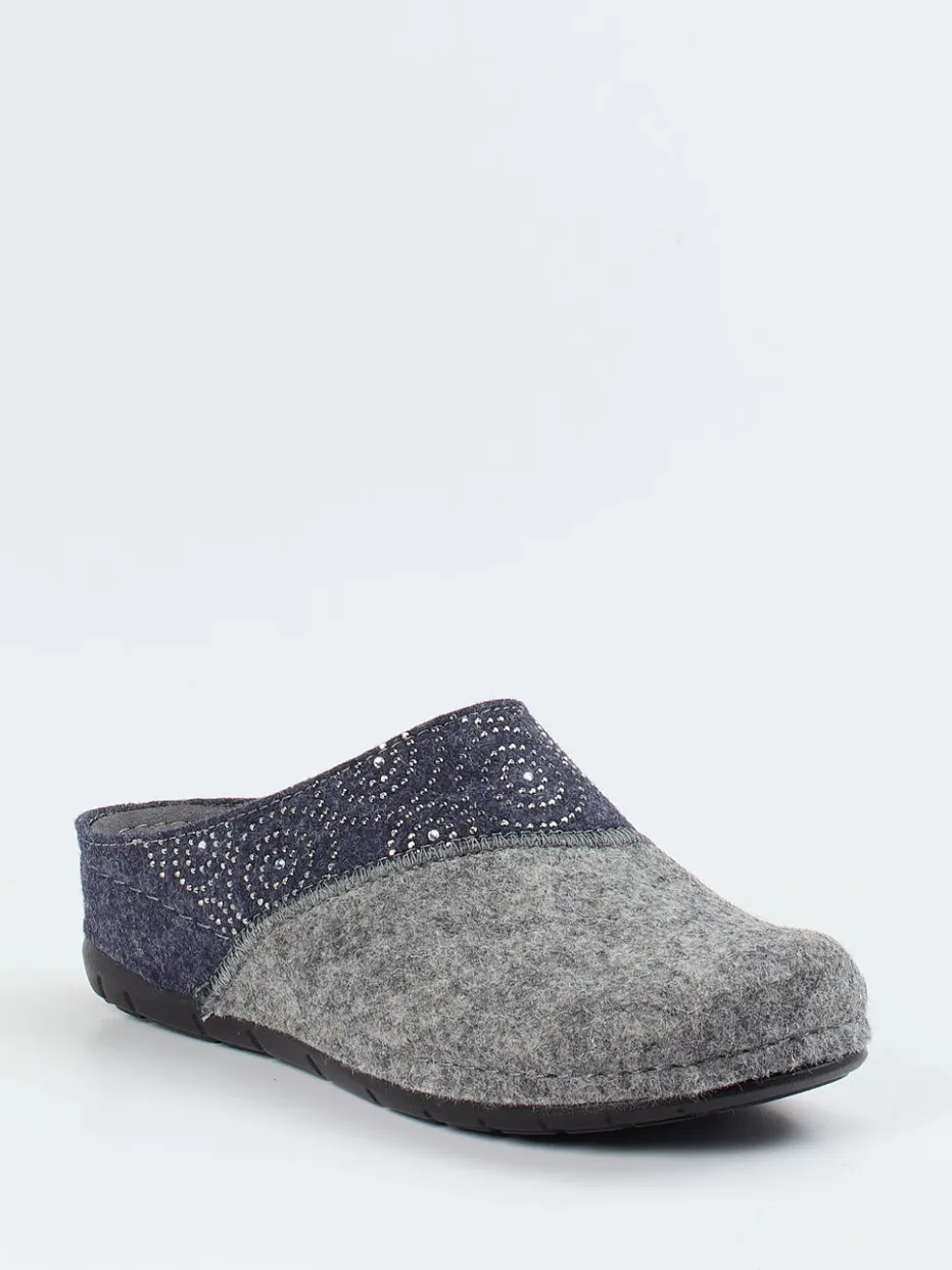 Wohltuender Komfort für entspannte Momente.Die Marke Rohde präsentiert mit diesen Damen-Pantoffeln ein durchdachtes Hausschuhmodell für kühle Tage. Ideal für gemütliche Stunden zuhause überzeugt das Modell durch wunderbar filziges Obermaterial in Mittelgrau, ergänzt durch dunkelblaue Elemente und funkelnde Steinapplikationen. Die Vorderpartie ist geschlossen, während die Ferse offen gestaltet ist – typisch für den Clog-Stil. Eine ergonomisch geformte Decksohle aus echtem Leder sorgt für angenehmen Trittkomfort. Die griffig profilierte Gummisohle bietet zusätzlich rutschhemmende Eigenschaften. Mit seiner minimalistischen Formensprache gelingt dieser Hauspantolette der stilvolle Spagat zwischen Funktionalität und zurückhaltendem Chic der Quiet-Luxury-Trends. Rohde steht für durchdachtes Design mit spürbarem Komfortanspruch.