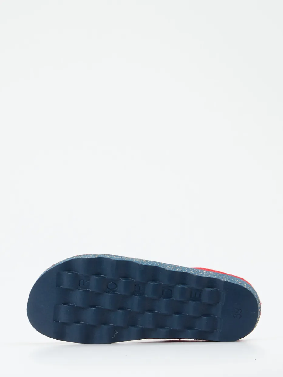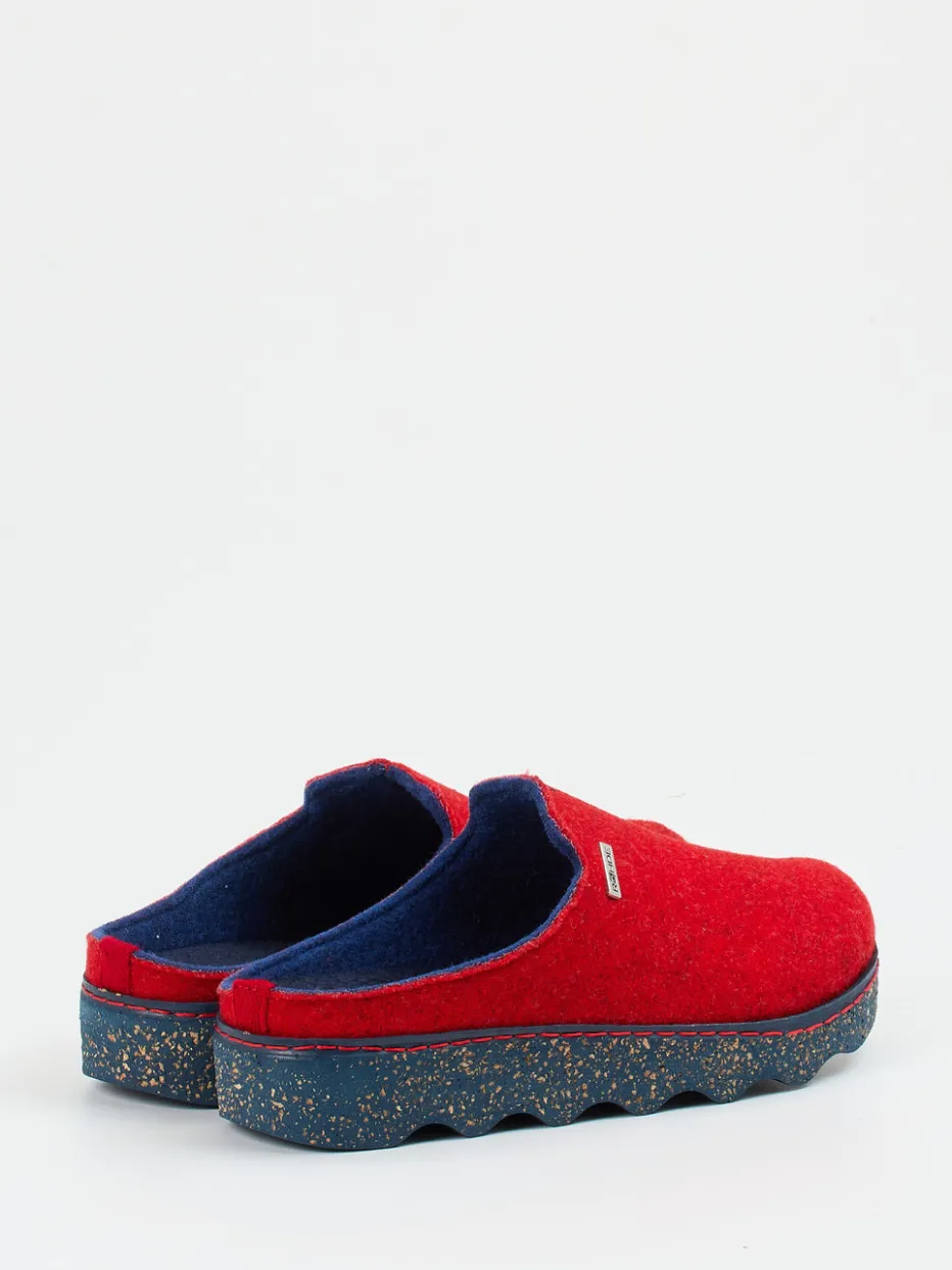 Die kräftige Farbe in Signalrot vereint sich mit hochwertigem, samtig strukturiertem Filz zu einem markanten Look, ergänzt durch das dunkelblaue Innenfutter aus Softfilz. Die ergonomisch designte, gesprenkelte Profilsohle bietet sicheren Halt auf glatten Böden und zeigt ein bewusst nachhaltiges Element durch den Recycling-Anteil. Offene Ferse und unkomplizierter Einstieg unterstreichen die Alltagstauglichkeit – perfekt für alle, die Komfort und Ästhetik im Wohnbereich schätzen. Passt ideal zu Loungewear in gedeckten Tönen.