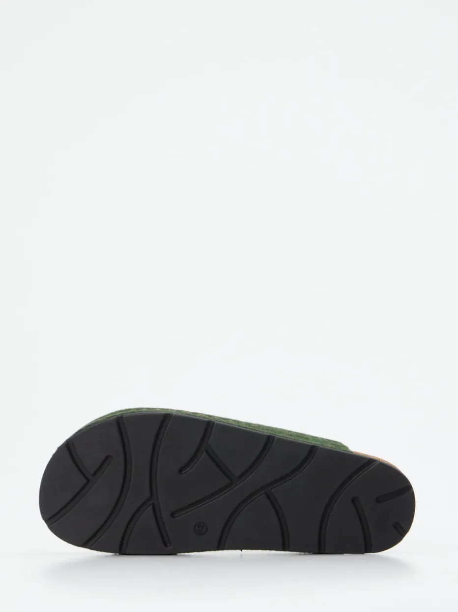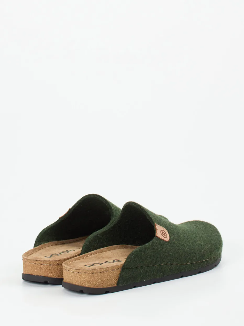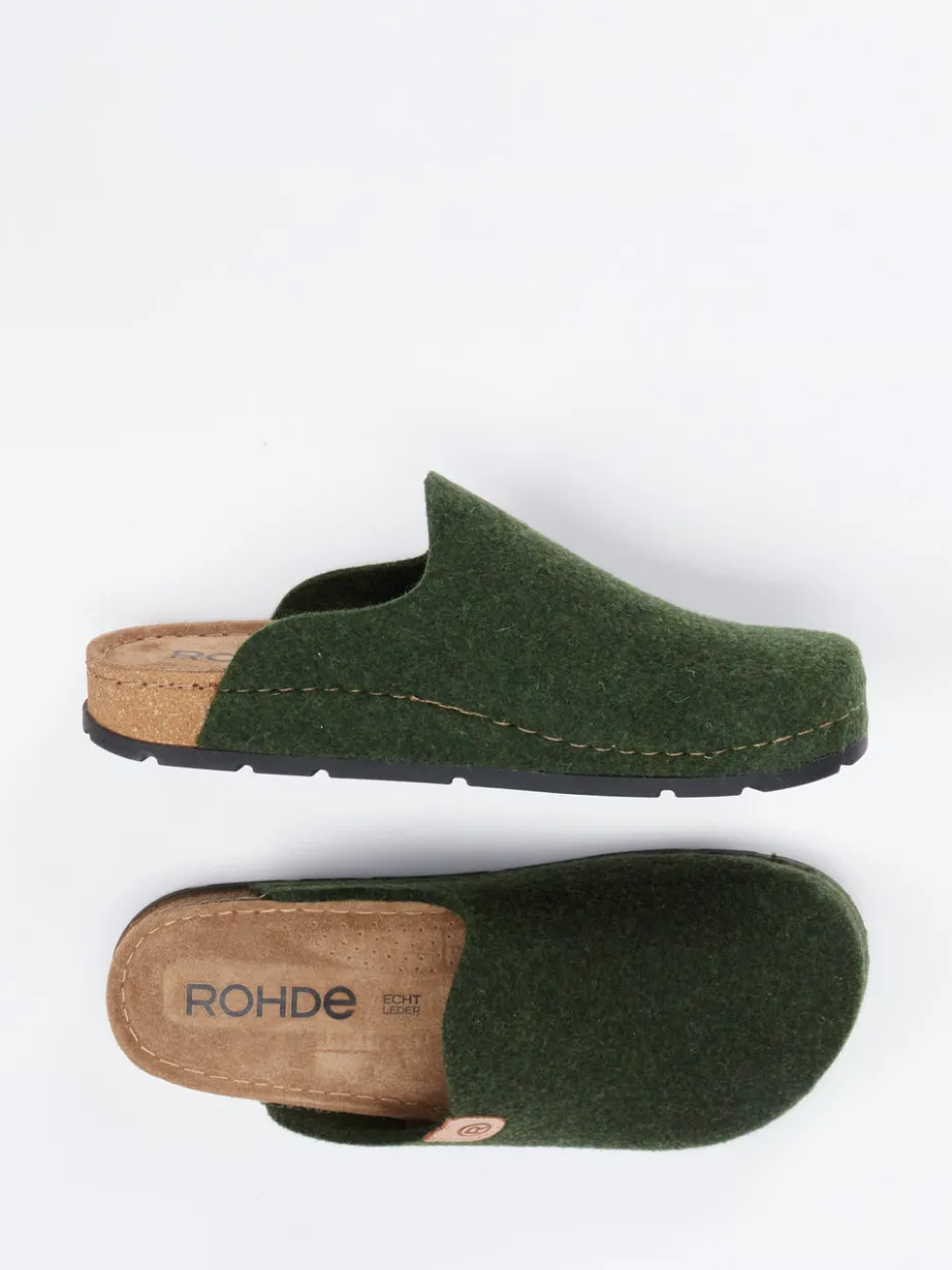 Natürlich entspannen mit Stil.Rohde interpretiert den klassischen Hausschuh als moderne Pantolette für Alltag und Zuhause. An langen Tagen daheim bietet die geschlossene Vorderpartie angenehme Geborgenheit – kombiniert mit einer offenen Ferse für schnellen Einstieg. Gefertigt aus wärmendem Filz in Tannengrün zeigt sich das Obermaterial matt und puristisch. Der naturfarbene Korkabsatz schließt ergonomisch ab und verleiht zusammen mit der lederbezogenen Innensohle optimalen Auftrittskomfort. Akzente wie die sichtbare Kontrastnaht und das geprägte Markenbadge setzen dezente Highlights. Der minimalistische Look passt zum „Comfort Core“-Trend und ergänzt mühelos Relax-Styles mit Wollsocken oder Loungewear. Zeitgemäßer Hausschuhkomfort auf Basis naturbelassener Materialien.