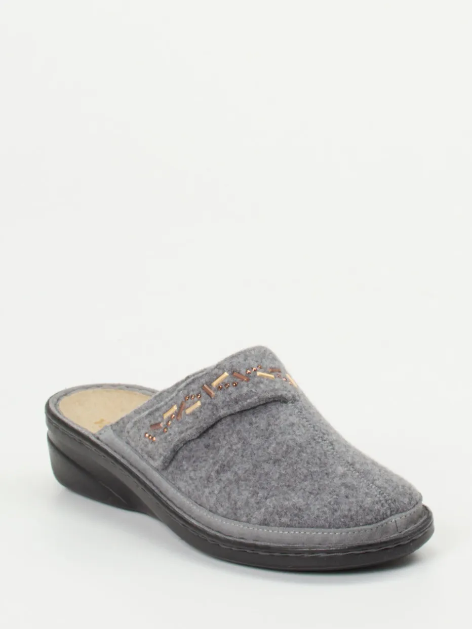 Der mitteltönige Graufilz mit filziger Haptik sorgt an kühlen Tagen für wohlige Wärme. Eine leicht erhöhte Gummisohle in Keilform unterstützt durch ergonomische Entlastung, während edle Stickdetails in Gold und Kupfer visuelle Akzente setzen. Die Form ist vorne geschlossen und hinten offen – so gelingt bequemes Hineinschlüpfen. Inspiriert vom Trend zu Soft Textures und Quiet Luxury bieten diese Pantoffeln ein harmonisches Gleichgewicht aus Funktion und Design. Optimal kombinierbar mit loungetauglicher Homewear oder Kuschelsocken.