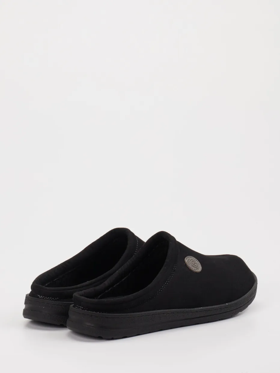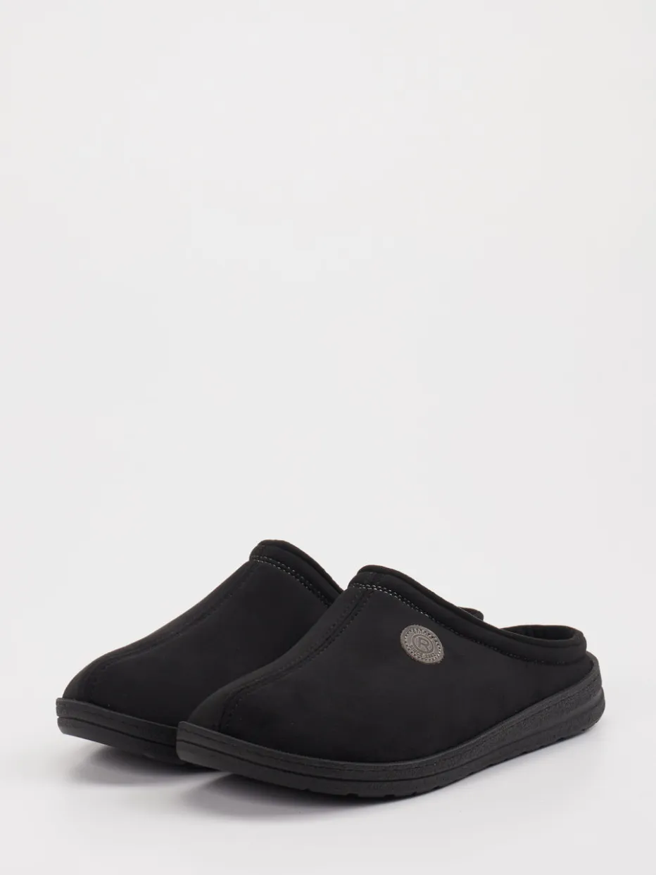 Pantoffeln von Rohde bieten weichen Komfort für entspannte Tage zuhause. Das Modell präsentiert sich in matter Synthetik-Oberfläche mit glatter Textur und ist vollständig in Schwarz gehalten. Die geschlossene Vorderpartie und die offene Ferse sorgen für ein unkompliziertes Anziehen, während der gepolsterte Einstieg und das warme Innenfutter aus Textilfaser für hohen Tragekomfort stehen. Die profilierte Gummilaufsohle ist ergonomisch gestaltet und rutschhemmend – ideal für glatte Böden. Dezente Ziernähte und ein seitlicher Logopatch setzen zurückhaltende Akzente. Der Look ist von Loungewear und dem Trend „Quiet Luxury“ inspiriert. Ein zuverlässiger Begleiter mit komfortorientierter Passform für entspannte Tage.