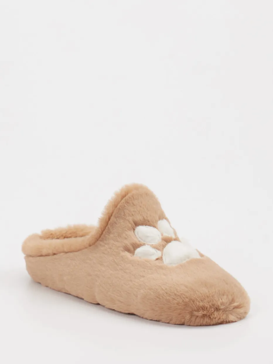 Tierisch gemütlicher Begleiter für Zuhause. Thies präsentiert mit diesen Pantoffeln eine charmante Loungewear-Ergänzung für den Herbst und Winter. Das weiche Textilmaterial in hellbrauner Farbgebung kombiniert mit flauschiger Oberfläche sorgt für behaglichen Komfort. Die geschlossene Vorderpartie und offene Ferse betonen den klassischen Pantoffelcharakter. Weiß abgesetzte Pfoten-Applikationen setzen verspielte Akzente im beliebten Kawaii-Stil. Die strukturierte Gummisohle bietet rutschfesten Halt auf glatten Böden. Ideal für alle, die Wert auf Gemütlichkeit und ein augenzwinkerndes Design legen. Ein kuscheliges Statement für stilvolles Relaxen mit dem Qualitätsversprechen von Thies.