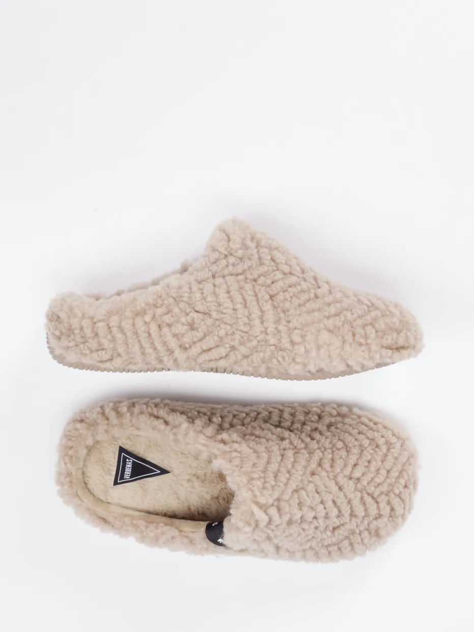 Weiches Wohlgefühl für entspannte Momente.Verbenas interpretiert klassische Pantoffeln für die kalte Jahreszeit neu. Ideal für gemütliche Abende daheim sorgt das Modell mit flauschigem Textilmaterial – inspiriert von Plüschoptik – für behagliche Wärme. Das beigebraune Unidesign wirkt dezent und passt zu minimalistischen Interieurs. Die geschlossene Front und offene Ferse ermöglichen ein schnelles Hineinschlüpfen, fixiert durch die flexible Gummisohle mit griffigem Rillenprofil. Aufgenähtes Markenlabel rundet das entspannte Design stilvoll ab. Ein echtes Highlight im „Coziness Core“-Trend und optimal zu Loungewear kombinierbar. Verlässlicher Komfort im Alltag mit typisch spanischem Stilverständnis von Verbenas.