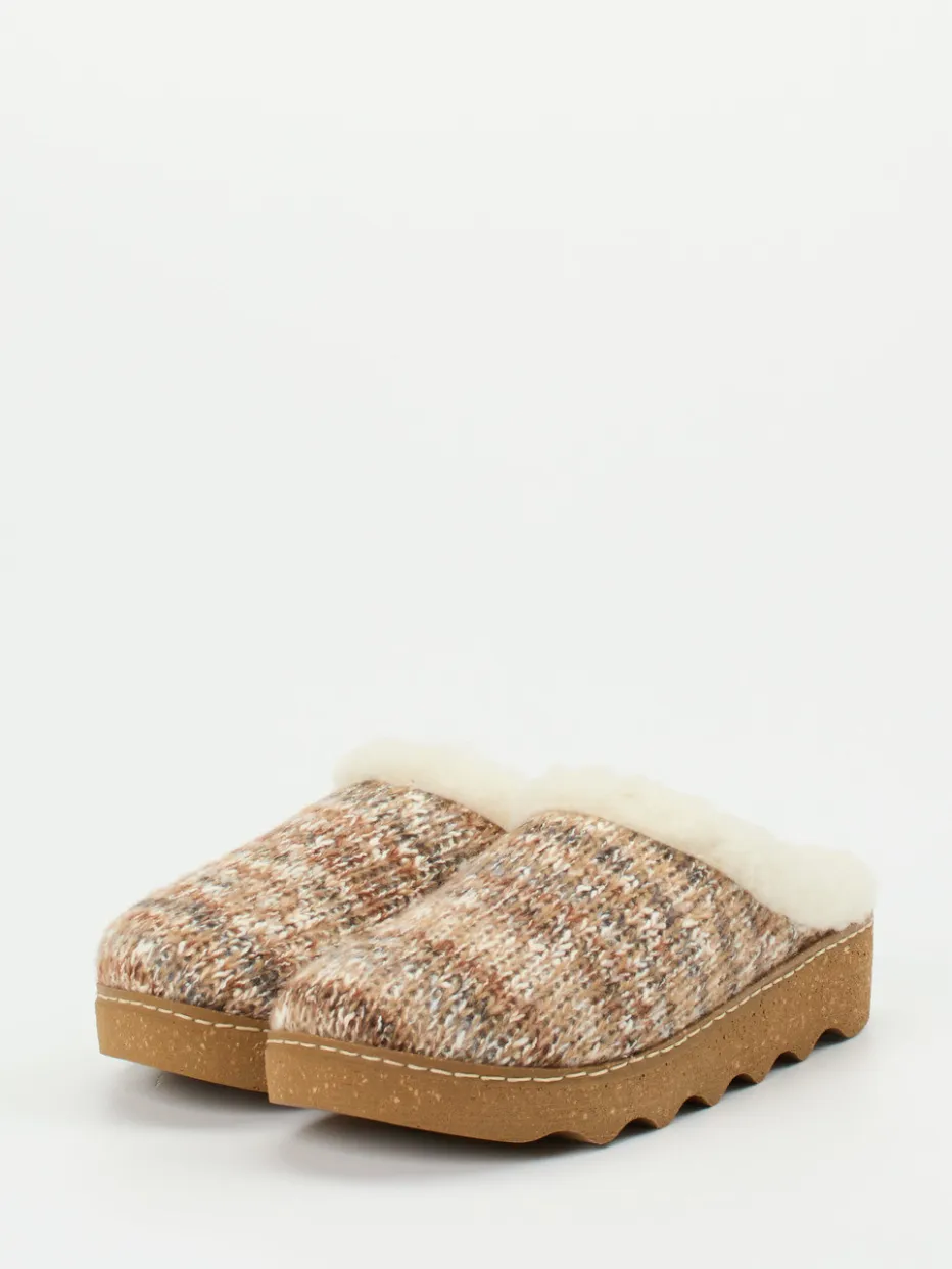 Ideal für gemütliche Stunden daheim: Das gestrickte Textilmaterial in melierter Mittelbraun-Optik verbindet Wohnlichkeit mit moderner Loungewear-Ästhetik. Ein satt gefütterter Einstieg mit Microfaser und Schurwoll-Anmutung sorgt für wohlige Wärme. Die geschlossene, rund zulaufende Silhouette wird durch eine profilierte, braune Porosohle in Korkoptik ergänzt, die trittsicheren Halt auf glatten Böden gewährleistet. Dezente Kontrastnähte betonen den handwerklichen Charakter, inspiriert vom Hygge-Trend. Kombinierbar mit Strickleggings oder flauschigem Morgenmantel.