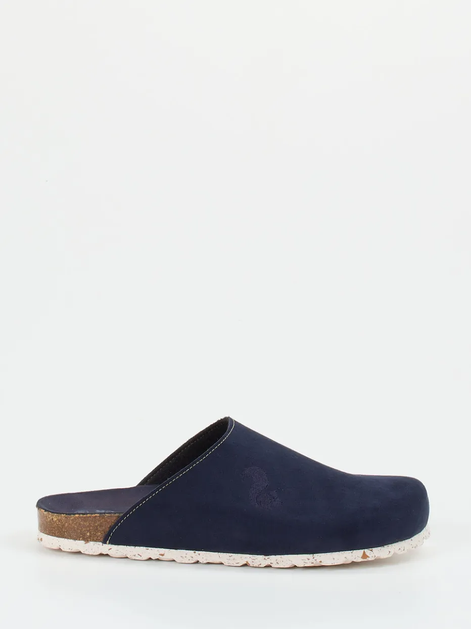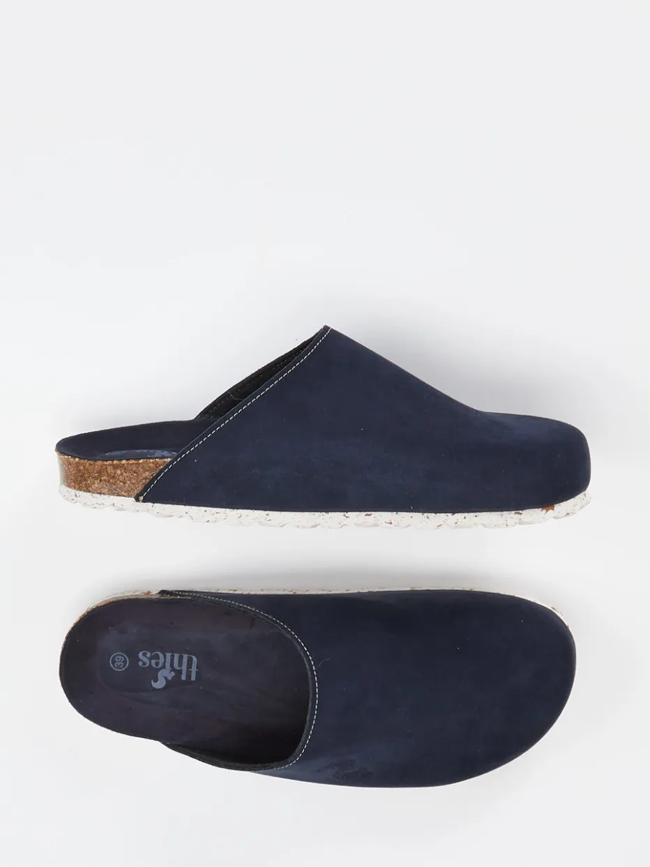 Form trifft Funktion im Alltag.Die Marke Thies erweitert ihr Hausschuh-Sortiment mit diesen dunkelblauen Pantoffeln für Damen und Herren. Ob auf dem Parkettboden oder der Terrasse – das samtige Veloursleder mit matter Oberfläche vermittelt ein natürliches Tragegefühl. Die ergonomisch geformte Kork-Zwischensohle und die profilierte Gummisohle sorgen für Halt und Komfort. Das Modell kommt ohne Verschluss, zeigt eine geschlossene, hinten offene Form und überzeugt durch dezente Ton-in-Ton-Stickerei sowie eine sichtbare Kontrastnaht an der Öffnung. Inspiriert vom Loungewear-Stil, passt es ideal zum entspannten Wohlfühl-Look. Der Mix aus nachhaltigen Naturmaterialien und klarer Formensprache steht für zeitgemäße Leichtigkeit im Zuhause.