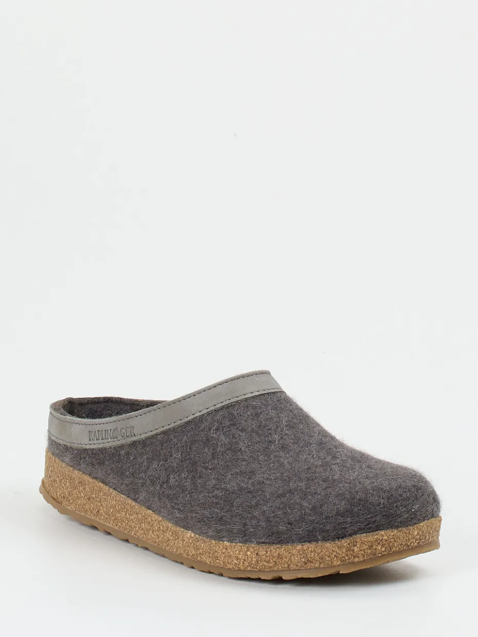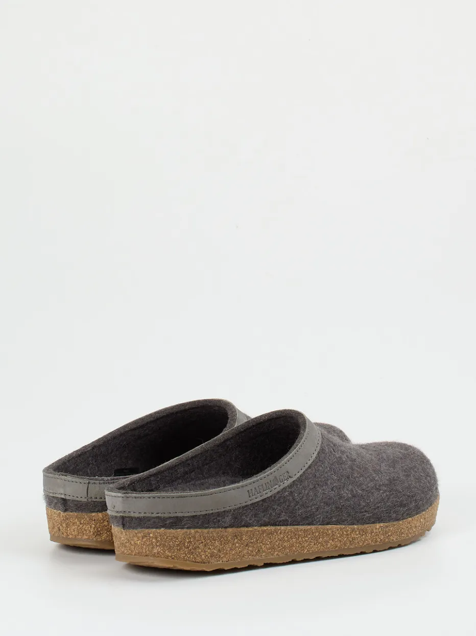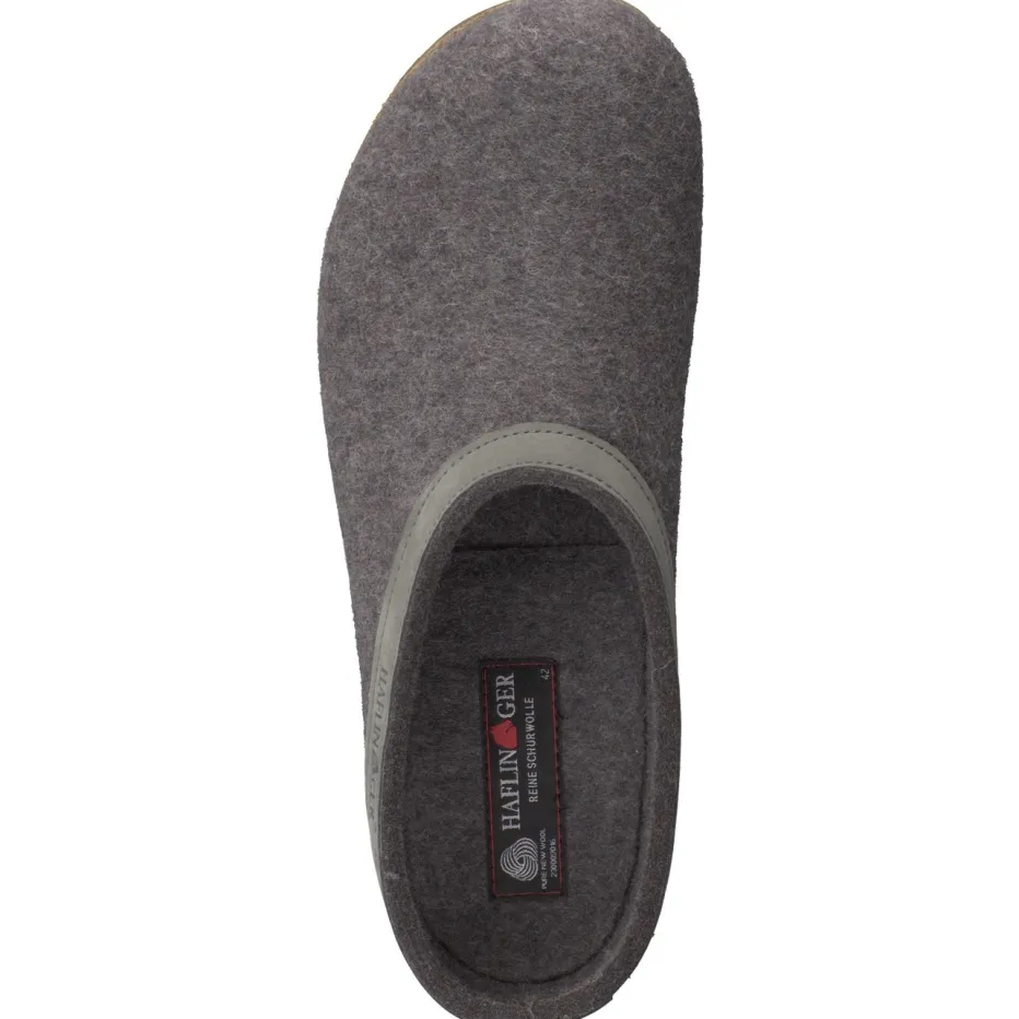 Für entspannte Stunden zu Hause bietet der geschlossene Pantoffel aus reiner, filziger Schurwolle ein warmes, atmungsaktives Tragegefühl. Der offene Fersenbereich in Clog-Silhouette ermöglicht leichtes Hineinschlüpfen. Das ergonomische Korkfußbett und die rutschfeste Gummisohle versprechen Trittsicherheit und Halt. Farblich überzeugt das Modell Ton-in-Ton in Anthrazitgrau mit stilvollem Kunstlederbesatz samt Logoprägung. Inspiriert vom „Slow Living“-Trend passt dazu skandinavische Loungewear ideal.