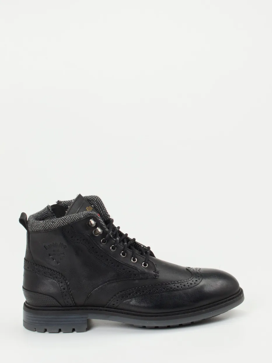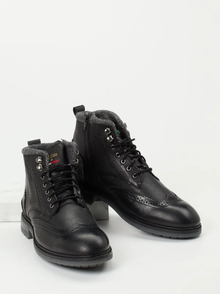 Stilvolle Präsenz bei jedem Schritt.Pantofola d’Oro präsentiert mit diesen Herren-Schnürboots ein Modell, das klassische Eleganz und zeitgemäße Funktionalität überzeugend vereint. Ideal für kalte Tage im urbanen Alltag, kombiniert der Boot schwarzes, dezent genarbtes Kalbleder in matter Optik mit einem markanten Brogue-Lochmuster und einem knöchelhohen Schnitt. Auffällig sind der zweifarbige Wollkragen im Hahnentritt sowie die silberfarbenen Metallösen. Die Gummisohle mit griffigem Profil sorgt für Trittsicherheit im Winter, während das warme Textilinnenfutter und ein seitlicher Reißverschluss hohen Tragekomfort versprechen. Passend zu Wollhose und Strick – ein Klassiker neu interpretiert. Markentypische Qualität mit maskulinem Designfokus – robust und stilvoll zugleich.