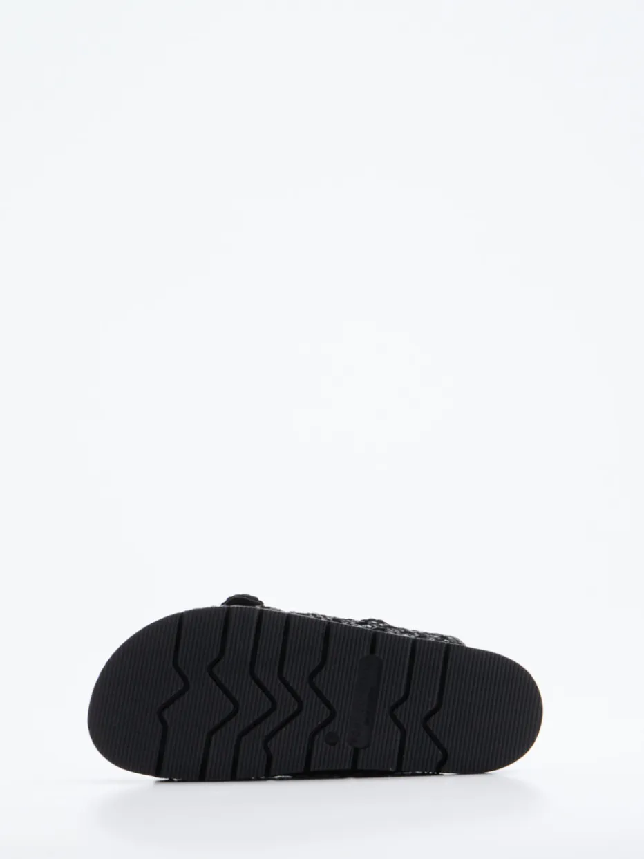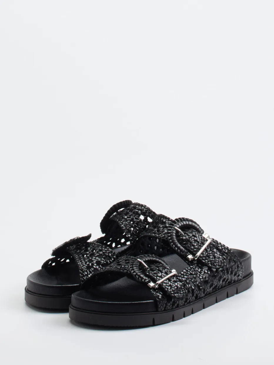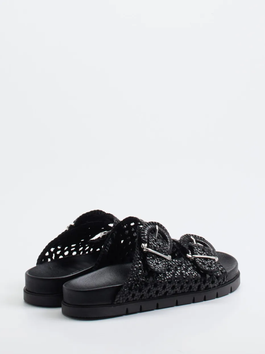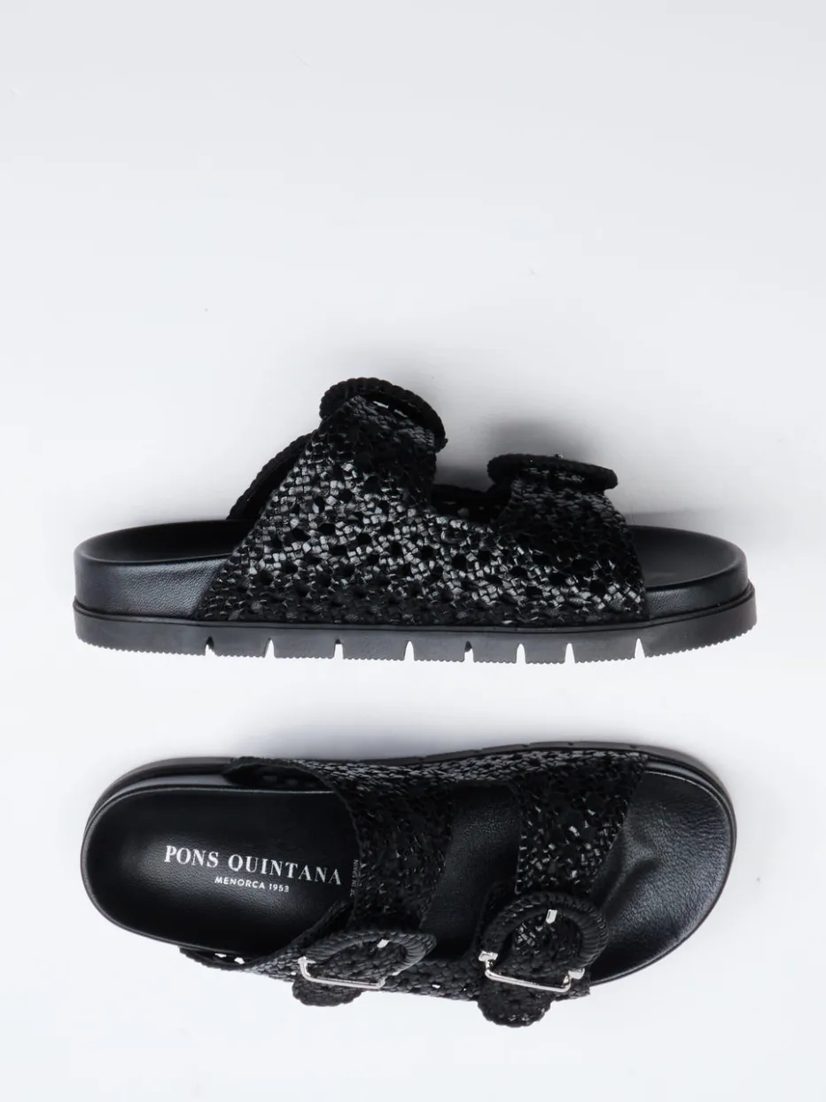 Handgeflochtene Textur und elegante Schnallen in Silberoptik verleihen dieser Pantolette von Pons Quintana eine moderne Leichtigkeit mit hohem Komfortanspruch.
