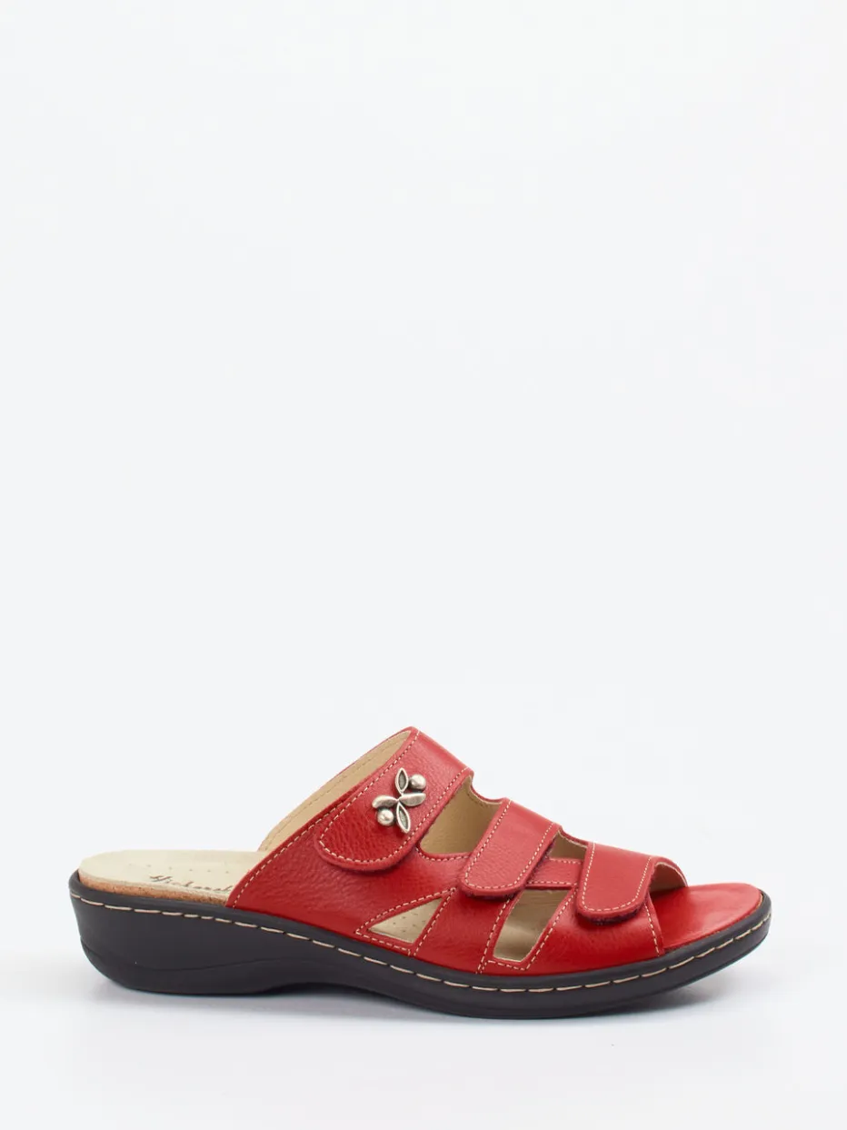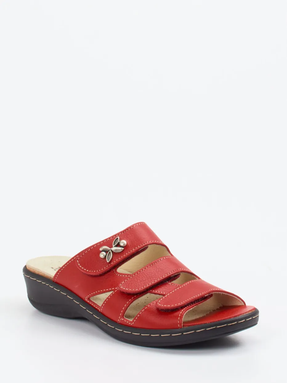 Komfort neu definiert.Hickersberger präsentiert eine Damen-Pantolette der Komfortklasse. Ideal für entspannte Tage zu Hause oder ausgedehnte Spaziergänge: Das Modell aus hochwertigem, genarbtem Kalbleder in kräftigem Tomatenrot punktet mit ergonomisch geformter Silhouette und individuell verstellbaren Klettverschlüssen. Eine silberfarbene Applikation und helle Kontrastnähte setzen dezente Akzente. Die gepolsterte, mit Leder bezogene Kräutereinlage unterstützt das gesunde Fußklima. Dank rutschhemmender PU-Sohle eignet sich die Pantolette auch für glatte Innenflächen. Perfekt zur weiten Leinenhose oder relaxtem Strick. Natürlich bequem – mit Hickersberger-Kompetenz für Fußgesundheit.