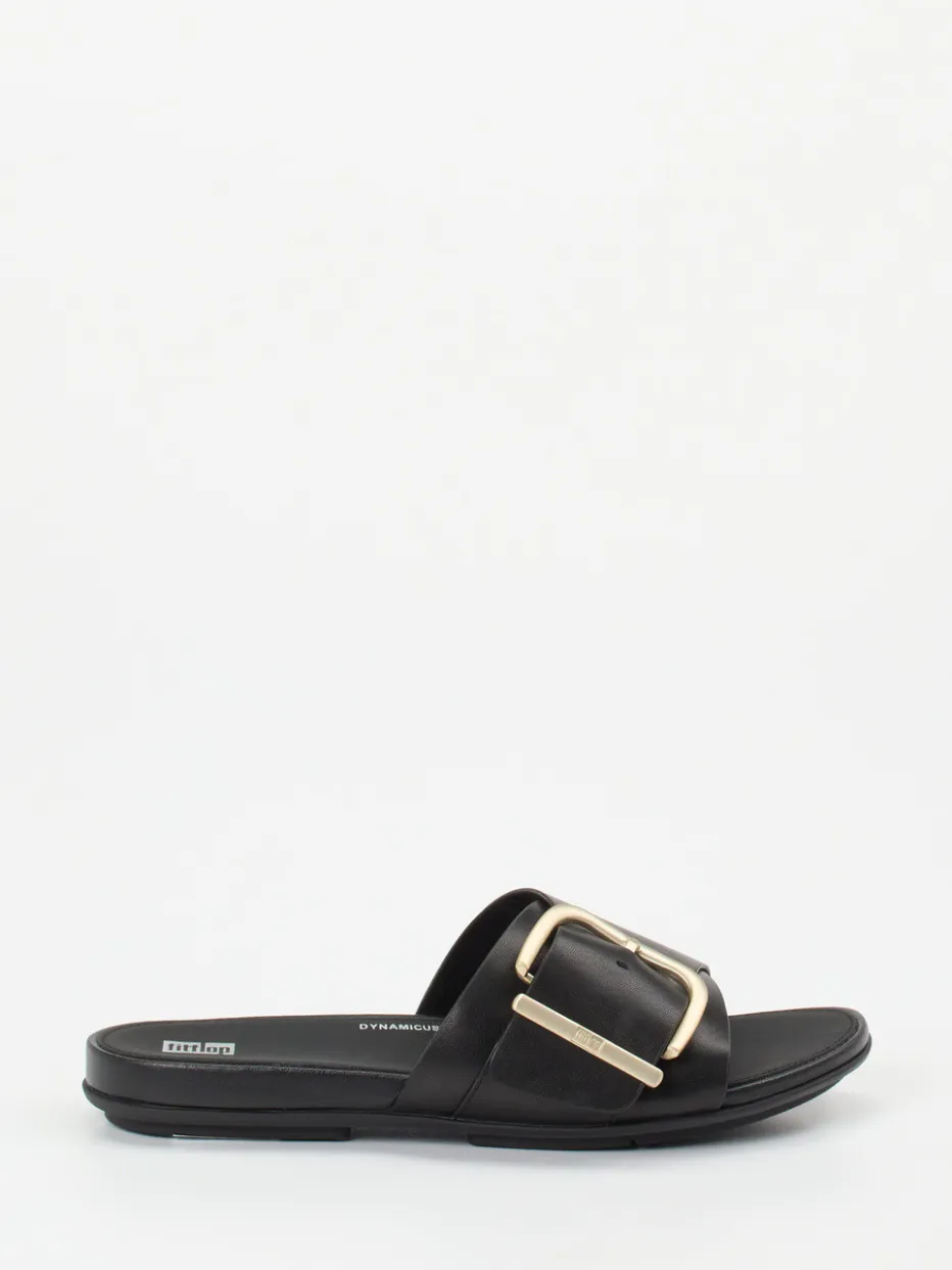 Modern-minimalistisch im Sommer unterwegs.FitFlop bringt mit dieser Pantolette ein Statement der leisen Eleganz in den Alltag. Ob beim Stadtbummel oder auf Reisen – das ergonomisch gepolsterte Fußbett mit Dynamicush-Technologie unterstützt langes Gehen und Stehen. Gefertigt aus schwarzem Kalbleder mit matter Oberfläche strahlt der Schuh dabei schlichte Raffinesse aus. Die flache, offene Silhouette und das Schlupfdesign machen ihn besonders bequem; die auffällig große, goldfarbene Schnalle setzt einen stilvollen Akzent im Metallic-Trend. Ideal zu luftiger Leinenkleidung und minimalistischen Accessoires. Ein durchdachtes Design mit Komfort-Plus – klarer FitFlop-Charakter für stilbewusste Alltagsmomente.
