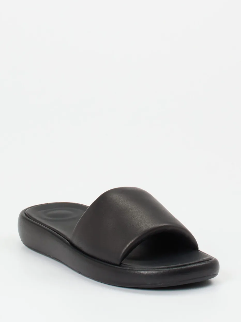 Reduktion als Stilprinzip.Die Marke FitFlop präsentiert mit dieser schwarzen Pantolette eine stilvolle Wahl für Alltag, Reise oder entspannte Stunden zu Hause. Die offene Slides-Silhouette kombiniert weiches Kalbleder mit einer samtig-matten Oberfläche und ergonomischem Fußbett. Der voluminöse, gepolsterte Riemen sorgt für optimalen Sitz, während die abriebfeste Gummisohle sicheren Halt bietet. Ohne Verschluss gestaltet, spiegelt das Modell den Streetwear-inspirierten „Quiet Luxury“-Trend wider und passt ideal zu minimalistischen Sommer-Outfits. Besonders harmonisch wirkt der Look zu leichten Shorts und Oversized-Shirts. Komfort und Understatement – FitFlop definiert entspannte Eleganz auf neuem Niveau.