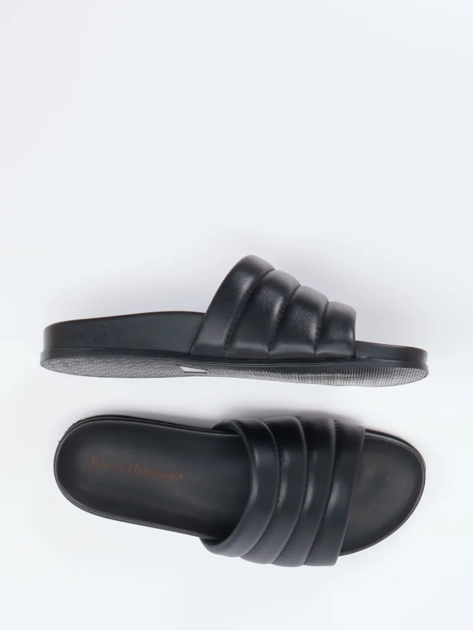 Minimalismus in Reinform.Ralph Harrison präsentiert diese stilvolle Herrenpantolette aus schwarzem Kalbleder. Ideal für entspannte Tage – ob zu Hause, im Urlaub oder in der Stadt. Der gepolsterte, dreifach gesteppte Riemen liegt angenehm am Fuß, während das ergonomisch geformte Lederfußbett sicheren Halt verspricht. Die Ton-in-Ton-Gummisohle ist profiliert, flexibel und rutschhemmend – ein funktionales Plus mit Streetwear-Attitüde. Mattes Finish und klare Linien entsprechen dem aktuellen Trend zur zurückhaltenden Eleganz. Ein komfortstarker Sommerbegleiter mit formklarer Designsprache von Ralph Harrison.