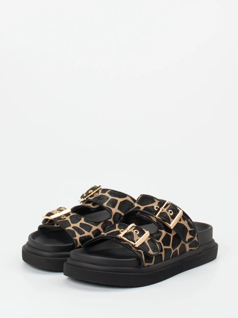 Die Statement-Pantolette von Andrea Puccini kombiniert ergonomische Form mit expressivem Giraffenprint und goldfarbenen Schnallen – ein Highlight für trendbewusste Looks.