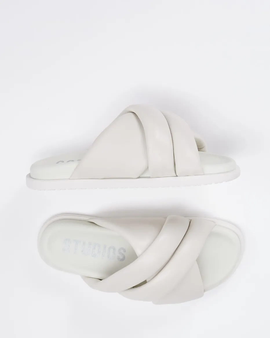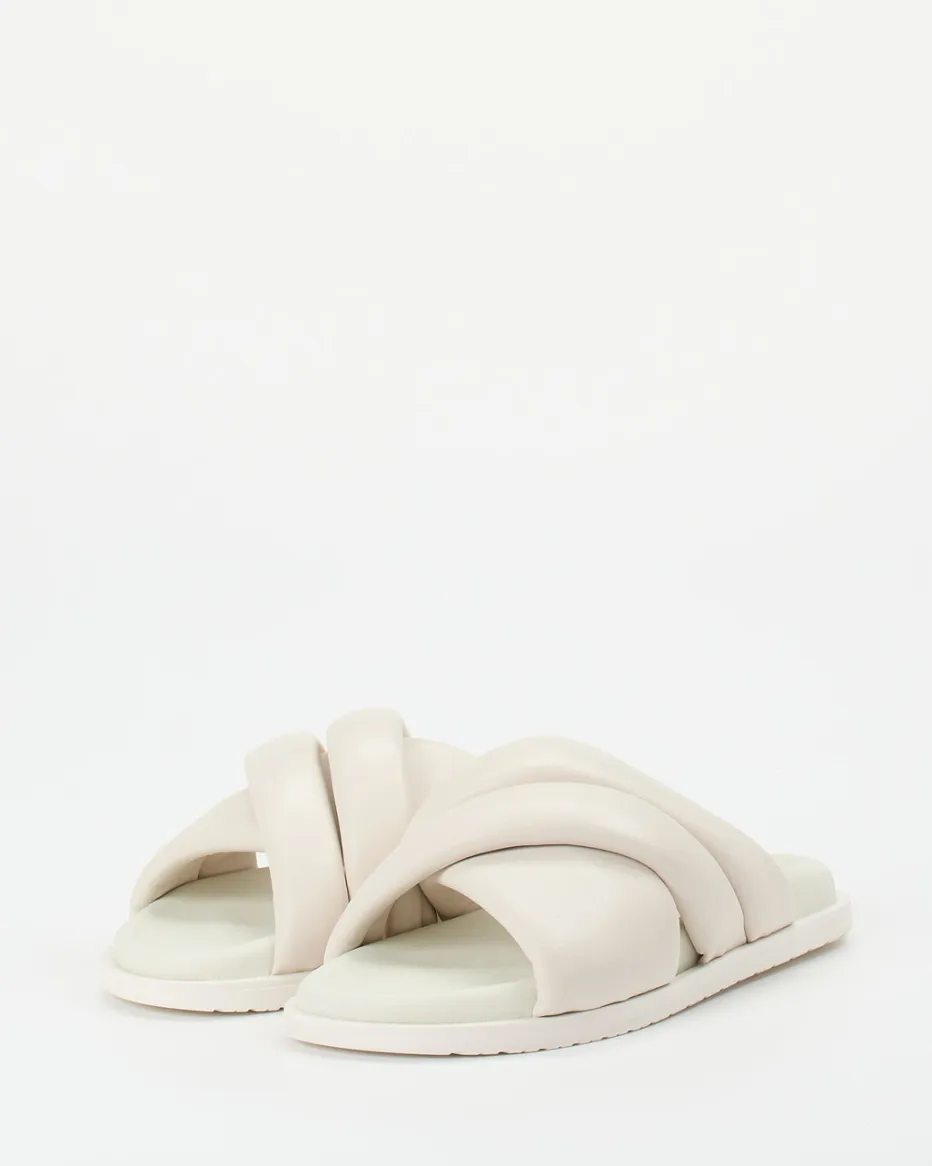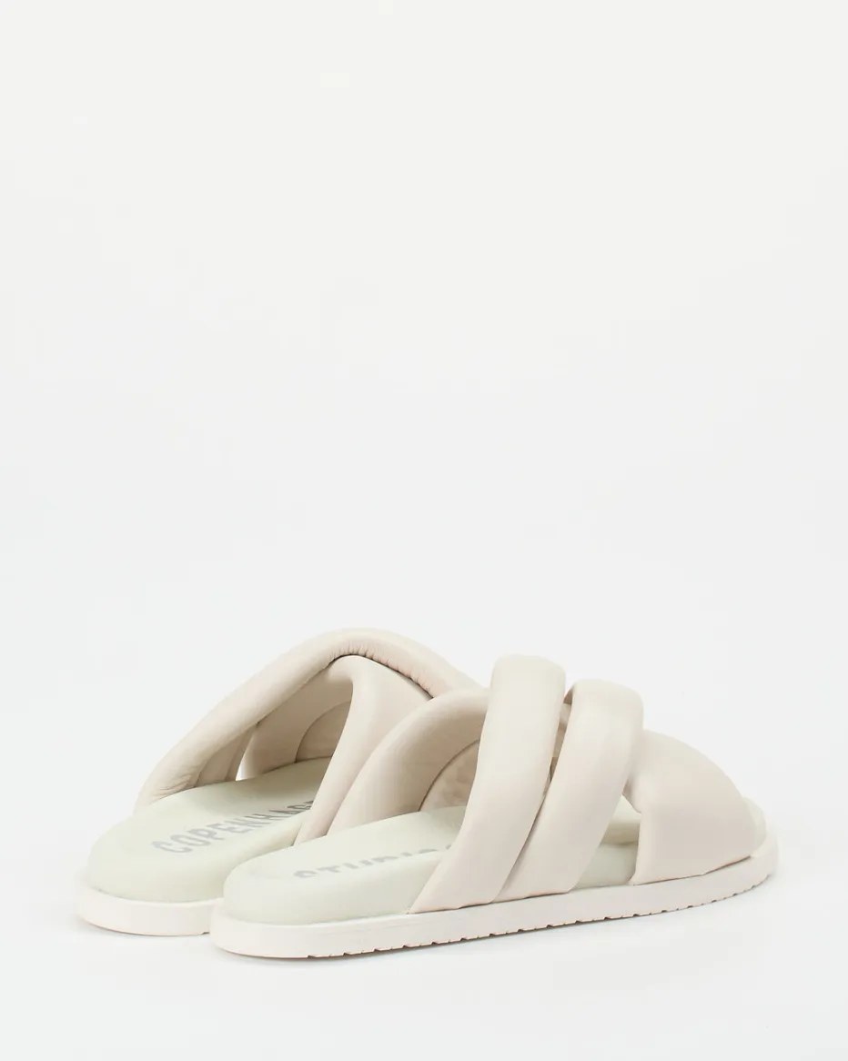 Sommerlicher Minimalismus in Perfektion.Copenhagen verleiht mit dieser Pantolette der Kategorie Slides einen klaren, urbanen Look. Für Tage, an denen Komfort und Stil aufeinandertreffen sollen, überzeugen die überkreuzten Riemen aus feinem Lammleder mit samtiger Haptik. Die matte Oberfläche wirkt in cremeweißem Ton besonders ruhig und hochwertig. Gummisohle und flache Silhouette bieten angenehmen Halt bei maximaler Bewegungsfreiheit – perfekt für Freizeit und Zuhause. Die gepolsterte Verarbeitung folgt dem Padded-Footwear-Trend und spricht Streetwear-affine Styles ebenso an wie Quiet-Luxury-Ästhetik. Kombiniert zu Leinen oder Oversize-Pieces ergibt sich ein zeitgemäßer, entspannter Look. Stilvoller Komfort mit typisch skandinavischem Designanspruch.
