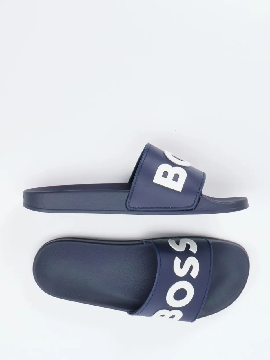 Sommer-Routine neu definiert.Die Pantolette von Boss ist ein funktionaler und stilbewusster Begleiter für Freizeit und Urlaub. Das dunkelblaue Synthetikmaterial mit matter Oberfläche liegt angenehm auf der Haut, während das ergonomisch geformte Fußbett für hohen Tragekomfort sorgt. Der breite Riemen in Schlupfform zeigt ein markantes, weißes Logo, das sich auf der Gummisohle als Prägung fortsetzt – ein Statement im Look von „Quiet Luxury“. Die offene, flache Silhouette unterstreicht die entspannte Ästhetik des Modells. Ideal kombinierbar mit Badeshorts oder Loungewear. Komfort und Logo-Akzent in typischer Boss-Prägnanz.