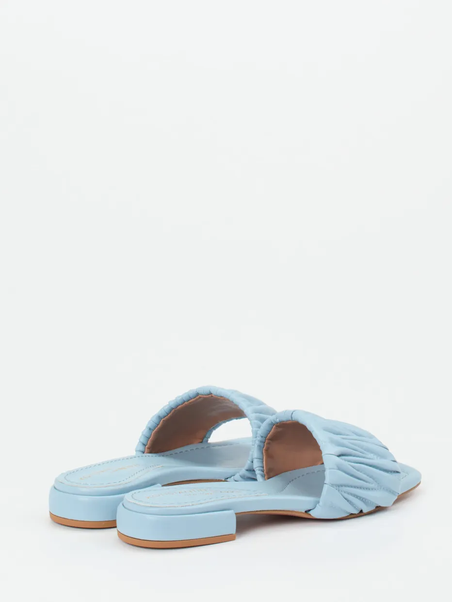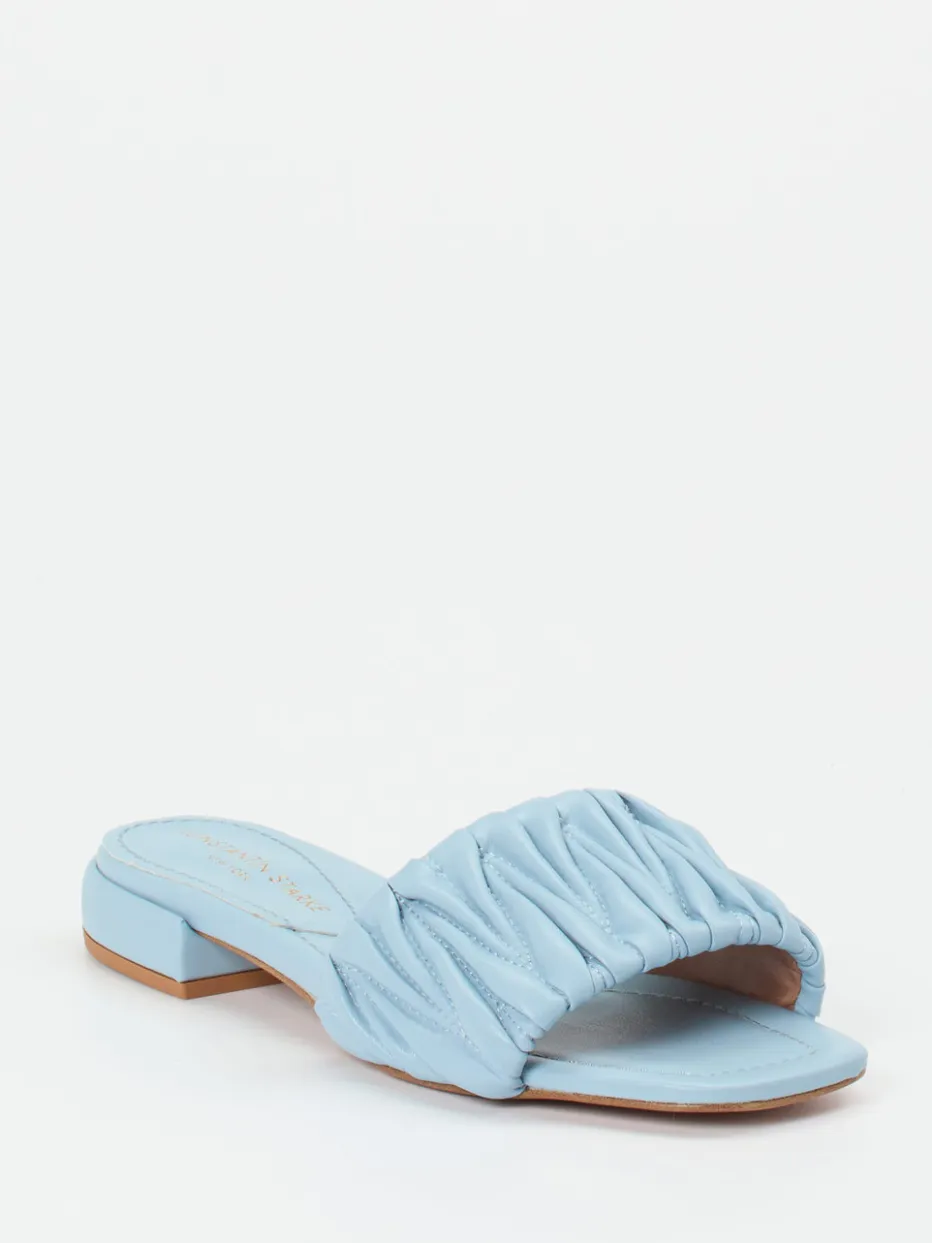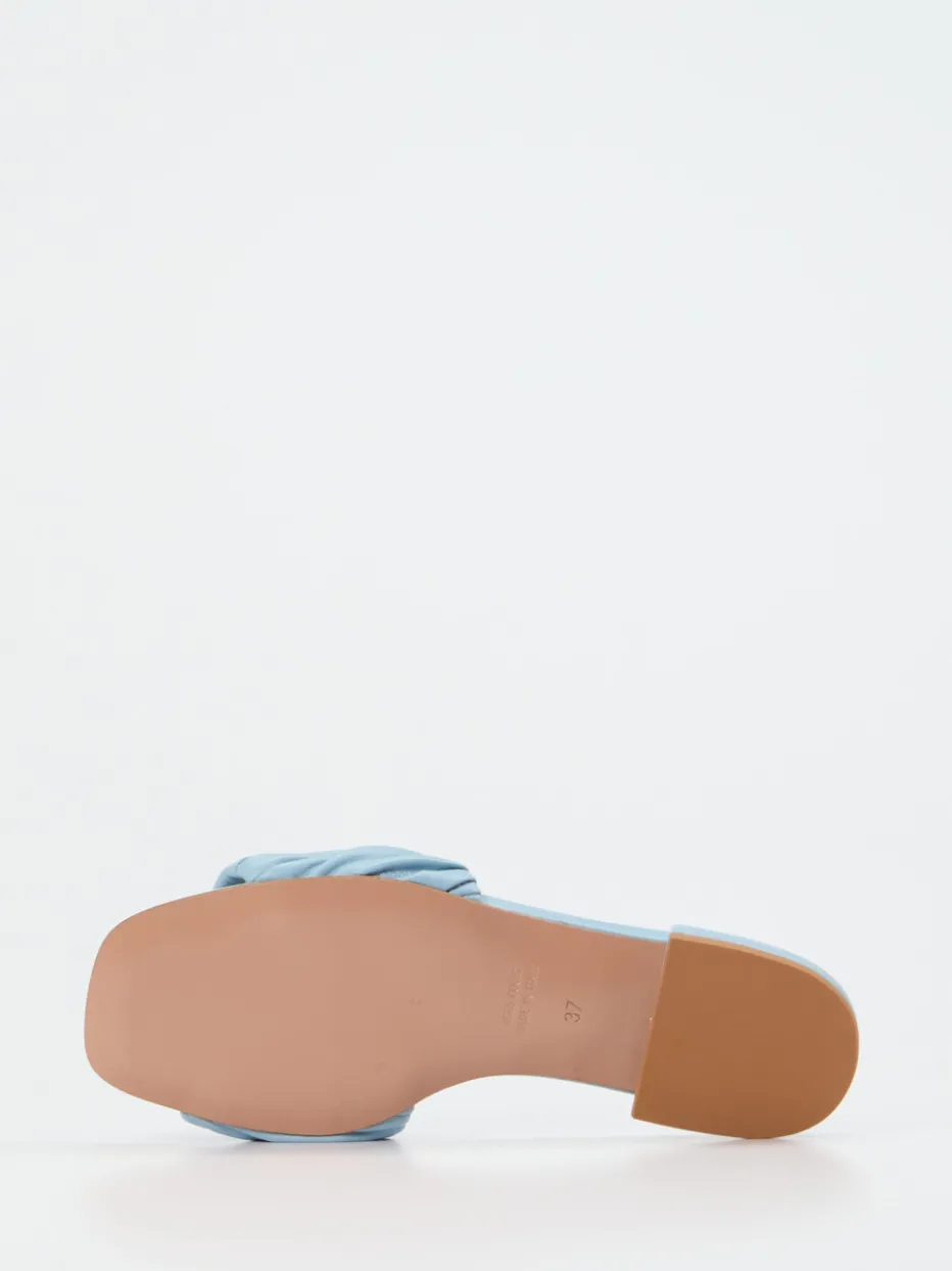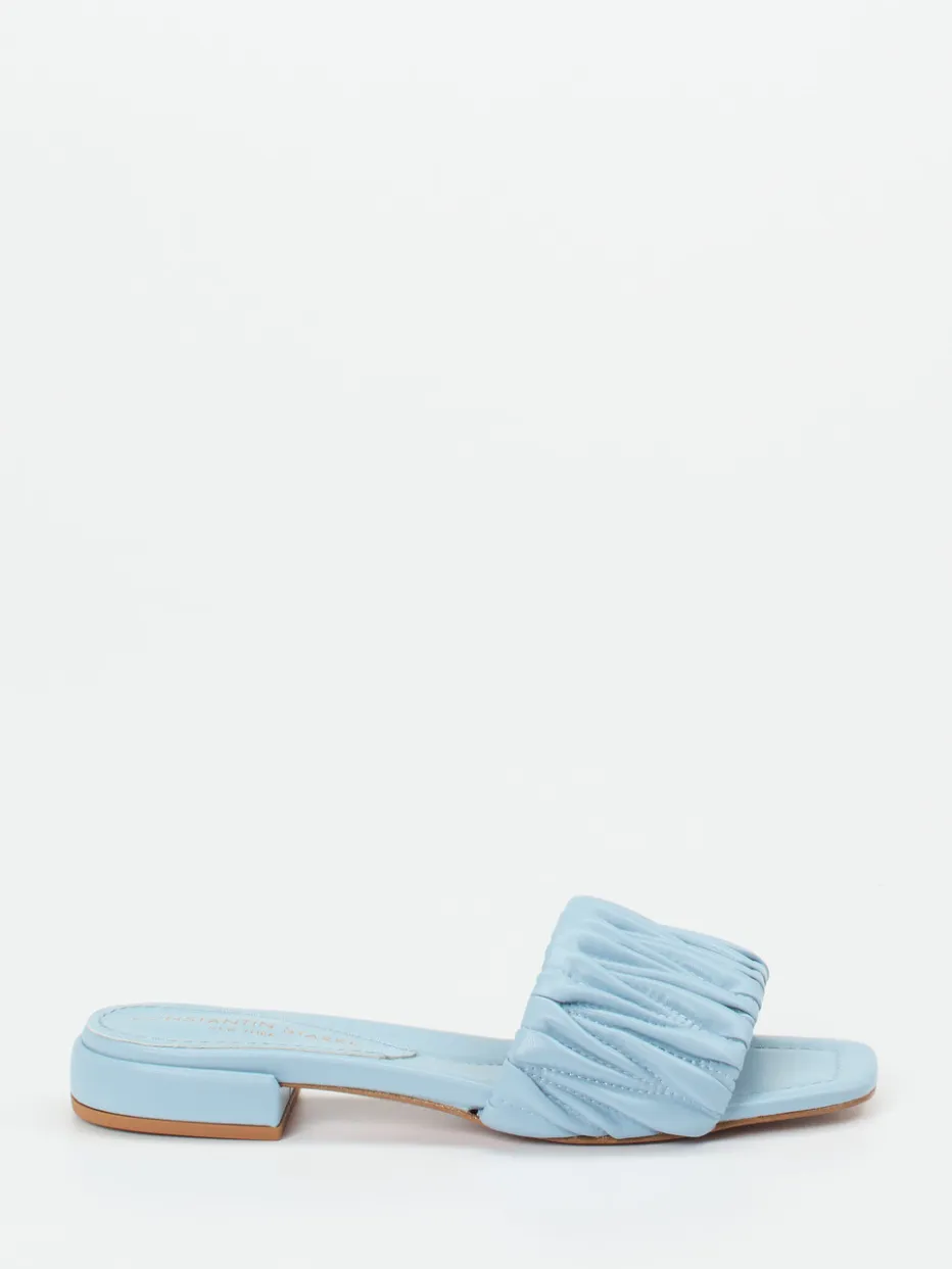 Ideal für entspannte Stadtbummel oder Urlaubstage vereint das Modell minimalistische Formgebung mit hohem Tragekomfort. Das synthetische Obermaterial in mattierter Lederoptik zeigt sich in zartem Hellblau. Raffungen am breiten Riemen und eine leicht eckige Zehenpartie setzen moderne Akzente. Die gepolsterte Fußbettstruktur sorgt für ein angenehmes Laufgefühl, unterstützt durch den flachen tonigen Blockabsatz. Die offene Silhouette passt perfekt zu luftigen Sommerkleidern oder pastellfarbenen Accessoires. Pastellfarben, Soft Volume und Quiet Luxury machen es zum Trendstück der Saison.