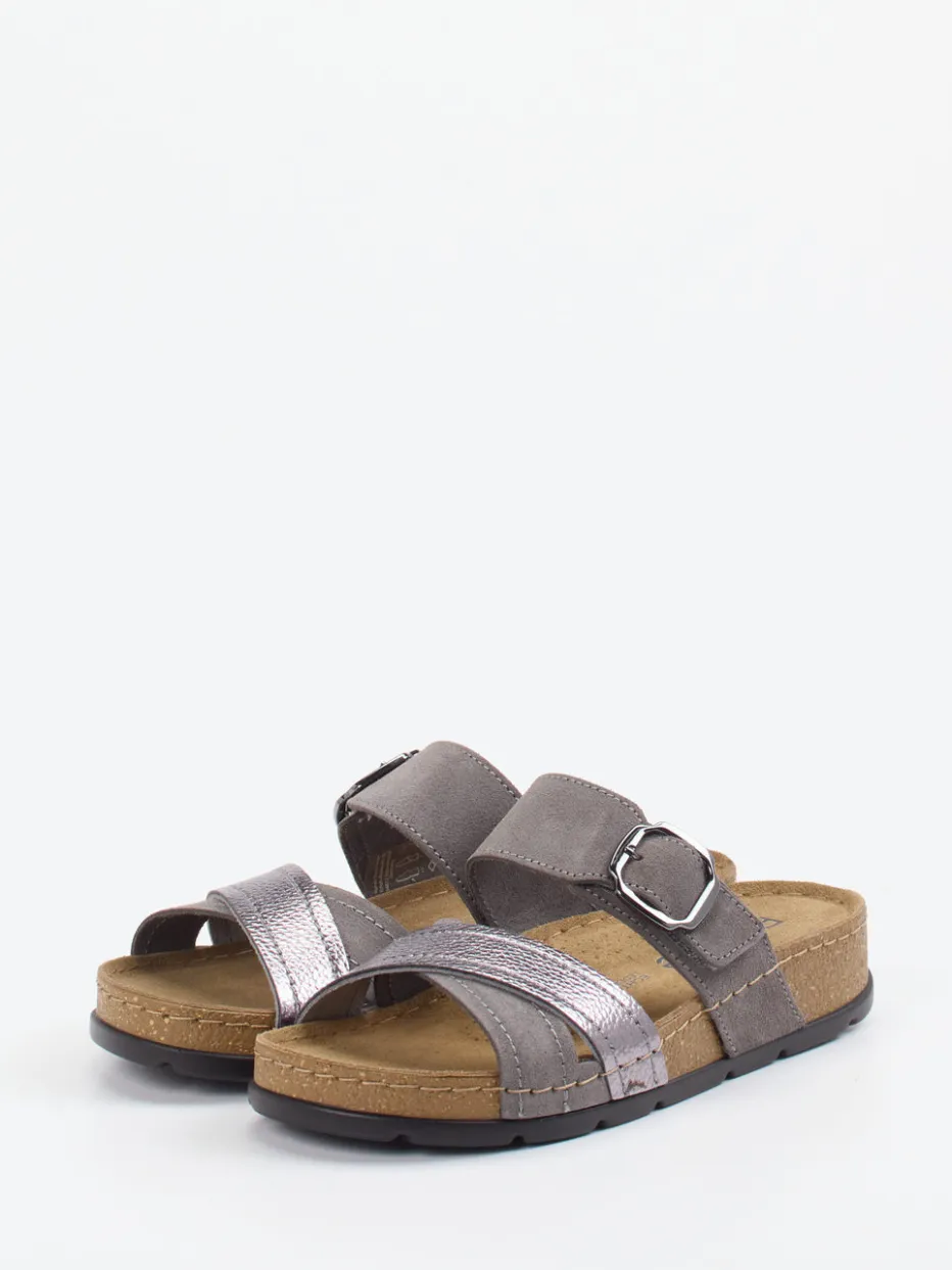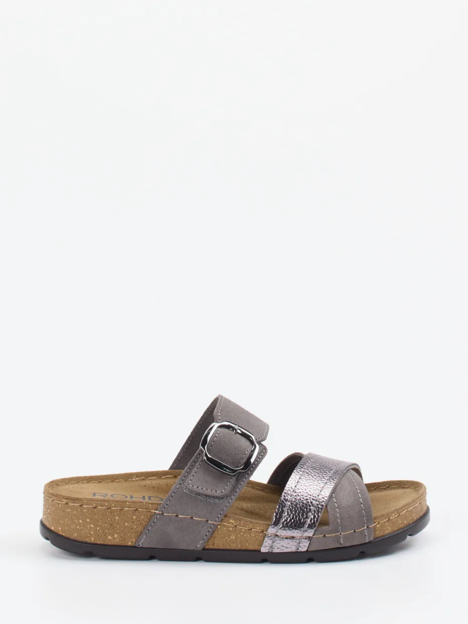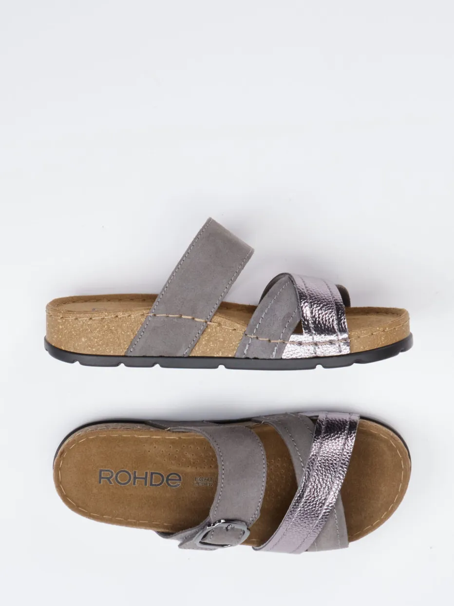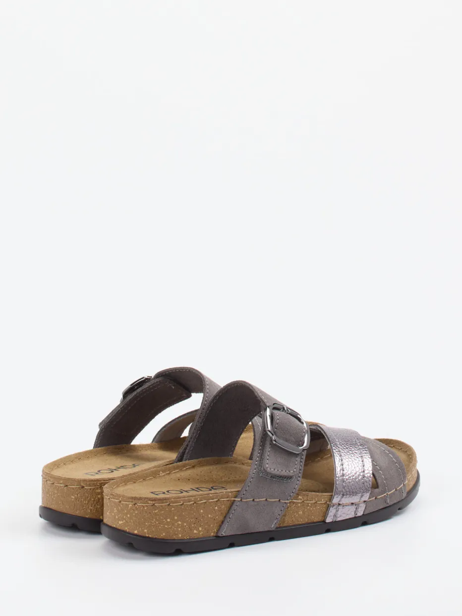 Schimmernder Komfort für entspannte Tage.Die Marke Rohde zeigt mit dieser Damen-Pantolette ein Modell, das Komfortbewusstsein und dezente Raffinesse vereint. Für entspannte Stunden zu Hause oder komfortable Wege im Alltag bietet die offen und flach gestaltete Pantolette ein weiches Fußbett aus Kork-Latex-Mix. Der Materialmix aus grauem Veloursleder und einem Metallic-Riemen in Roséoptik wirkt modern und hochwertig. Die individuell verstellbare Schnalle und die rutschhemmende Gummisohle runden das funktionale Gesamtbild ab. Das Design reflektiert den Trend zu „Quiet Luxury“ und überzeugt durch minimalistische Klarheit. Der dezente Metallic-Effekt verleiht dem funktionalen Komfortmodell eine stilvolle Leichtigkeit – ganz im Zeichen der Rohde-Qualität.