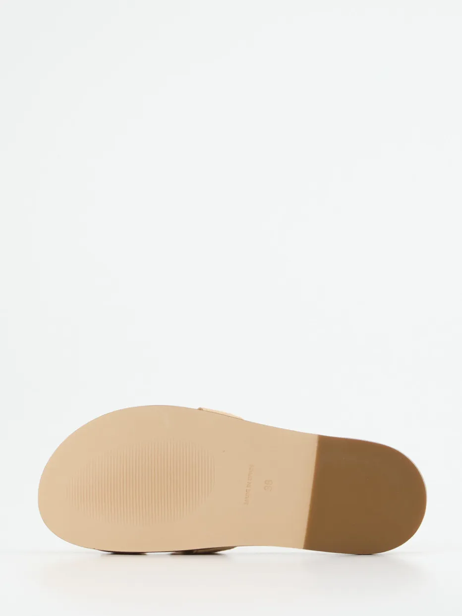 Stilvolle Leichtigkeit trifft edles Detail.Die Pantolette von Ralph Harrison verkörpert feminine Eleganz für sommerliche Gelegenheiten. Ob beim entspannten Stadtbummel oder als Akzent zu luftigen Strand-Looks – ihr beigefarbenes Veloursleder mit samtiger Haptik wirkt stilvoll zurückhaltend. Die breite, matte Bandage wird durch eine prägnante, goldfarbene Schnalle mit Kristallbesatz akzentuiert und setzt ein dezentes Statement im Sinne des „Quiet Luxury“. Die gepolsterte Ledersohle sorgt für angenehmen Komfort, während die offene Schlupfform und flache Silhouette den minimalistischen Anspruch unterstreichen. Besonders harmonisch ergänzt durch Tuniken oder natürliche Accessoires. Ein sommerlicher Essential mit raffiniertem Design-Fokus und Markencharakter.