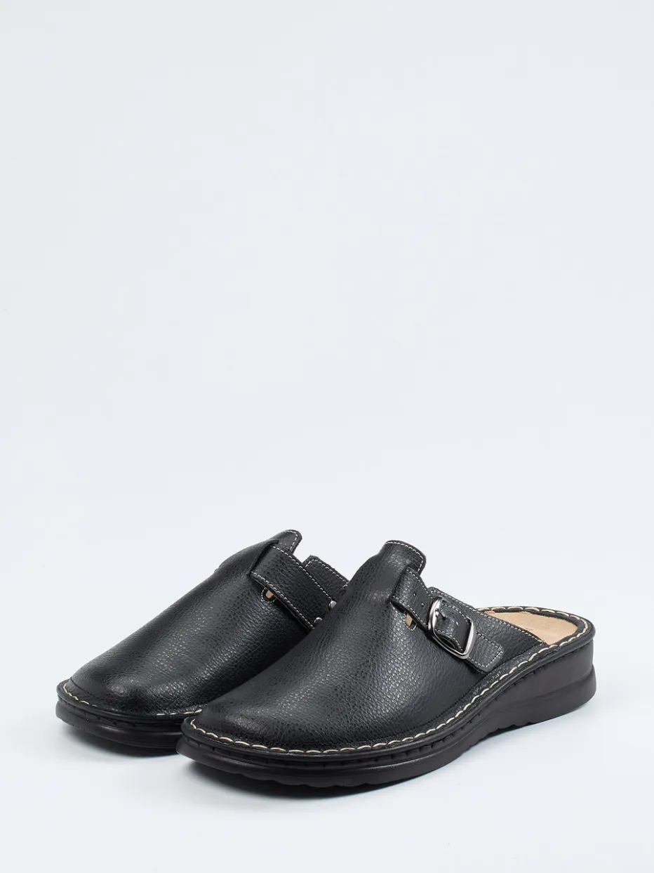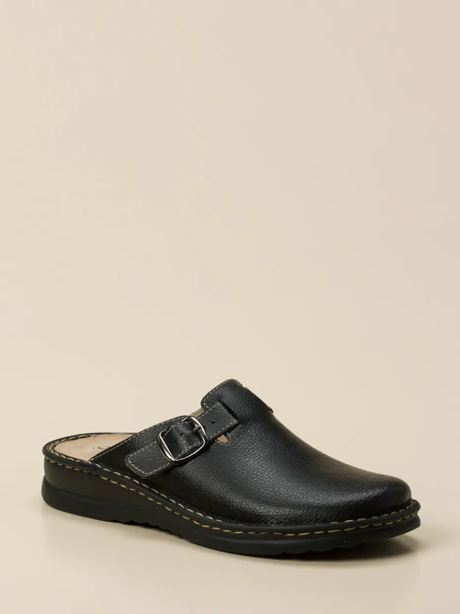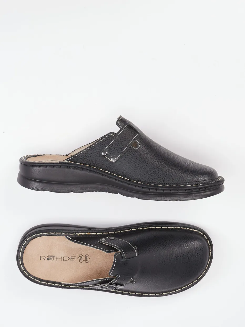 Rohde präsentiert stilvolle Pantoletten für entspannte Momente. Das Modell ist aus schwarzem, grobnarbigem Kalbleder gefertigt und bietet dank weicher Polsterung und verstellbarer Schnalle eine fußfreundliche Passform.