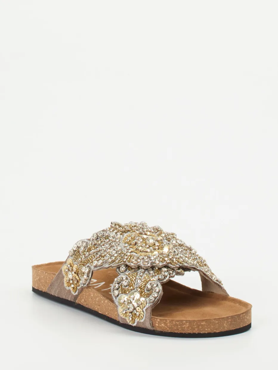 Aufwendig verzierte Pantoletten mit floralem Glanz, komfortabler Passform und Boho-Glam-Flair – eine gefragte Wahl für sommerliche Auftritte.