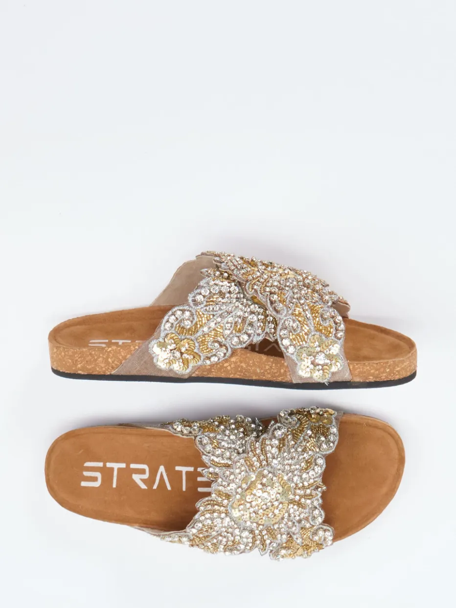 Glanzvolle Auftritte mit Leichtigkeit.Die Damen-Pantoletten von Strategia verbinden auffälliges Design mit bequemer Verarbeitung. Ideal für Sommerfeste oder stilvolle Urlaubsmomente kombinieren sie Metallicleder mit samtigem Textil, üppiger Perlen- und Paillettenstickerei sowie einem offen gearbeiteten Kreuzband-Design in Champagnerbeige und Gold. Das lederbezogene Korkfußbett bietet angenehme Flexibilität, die Gummisohle unterstreicht Haltbarkeit. Die Einflüsse aus Boho und orientalischem Glam spiegeln aktuelle Detailtrends wider. Besonders stimmig zu Kaftans oder Accessoires mit Goldakzenten. Designorientierter Komfort mit Statement-Charakter – typisch Strategia.