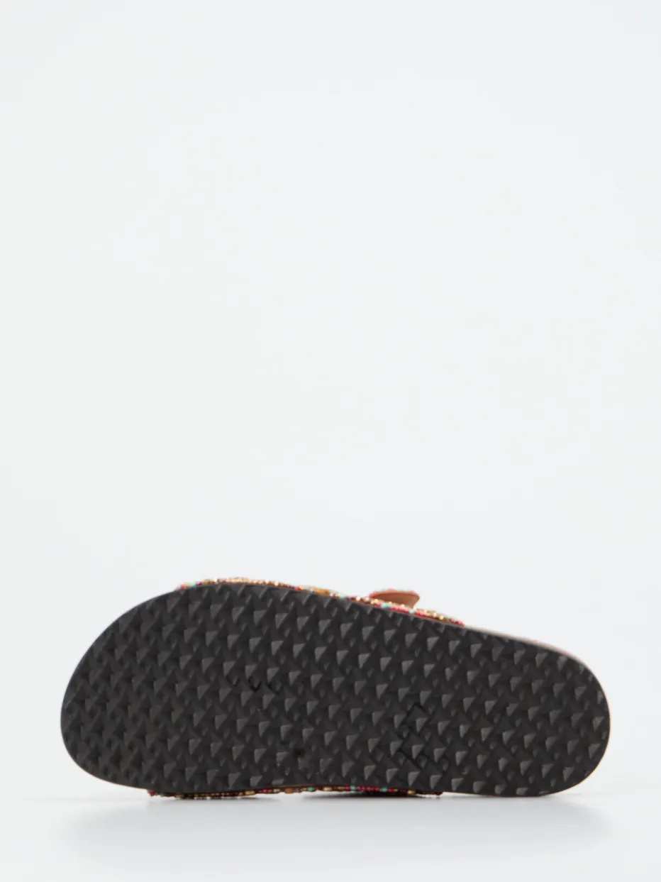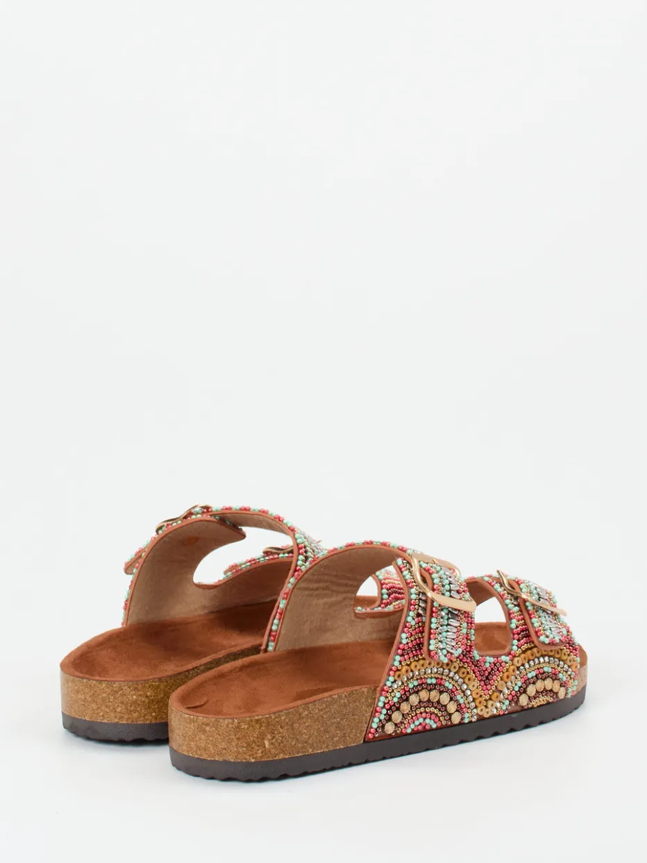 Diese Pantoletten vereinen edle Metallic-Optik mit aufwendiger Perlenstickerei in sommerlichen Farben. Das anatomisch geformte Korkfußbett bietet langanhaltenden Tragekomfort.