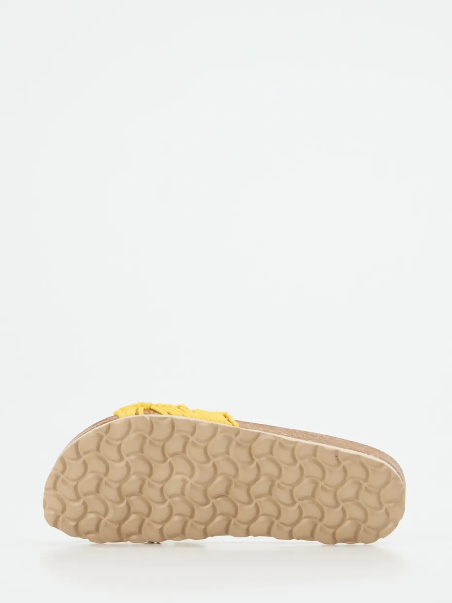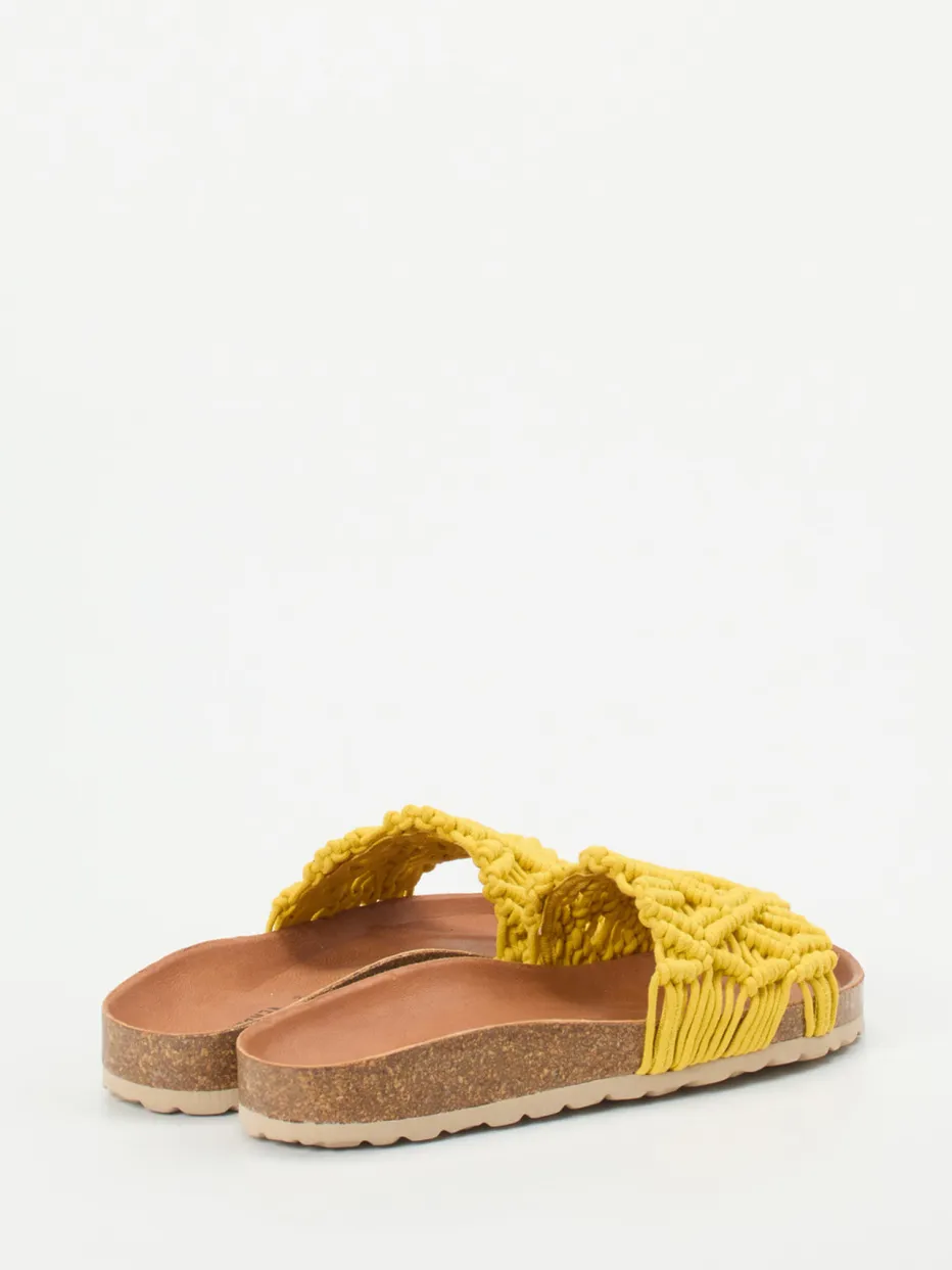 Die handwerklich inspirierte Makramee-Struktur der Pantoletten trifft auf ein ergonomisches Kork-Fußbett – ideal für stilbewusste Sommertage.