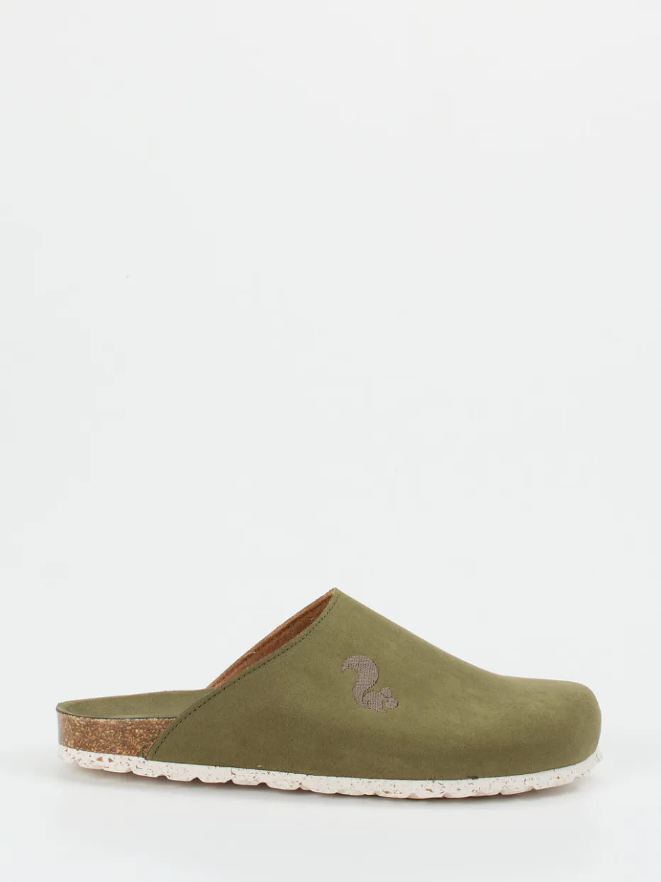 Mit ihrem ergonomischen Kork-Fußbett und dem samtig-matt strukturierten Veloursleder in Olivgrün bietet sie ein rundum angenehmes Tragegefühl. Das geschlossene Vorderblatt und die offene Ferse unterstreichen die klassische Silhouette, während gesticktes Seitenlogo und gesprenkelte Gummisohle dezente Akzente setzen. Die weiche Textilfütterung steigert den Wohlfühlfaktor zusätzlich. Ideal für nachhaltigkeitsbewusste Trägerinnen im „Nature Core“-Stil.