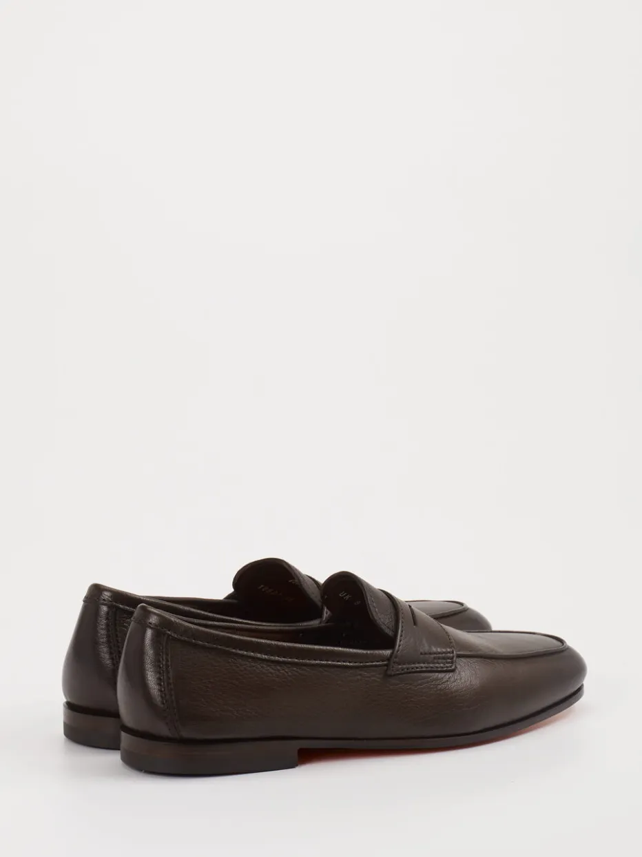 Understatement mit Format. Der Santoni Halbschuh überzeugt als klassischer Penny Loafer für Herren. Dank genarbtem Kalbleder in Dunkelbraun, flacher Silhouette und detailarmer Linienführung passt der Schuh ideal zu urbanen Looks mit Anspruch. Die Schlupfform erleichtert den Einstieg, während die orangefarbene Ledersohle mit Goodyear-Rahmen handwerkliche Qualität signalisiert. Minimalistische Designelemente wie Ton-in-Ton-Nähte unterstreichen die fließende Form. Ideal für smarte Outfits zwischen Büro und Business-Brunch – mit dunkelbraunem Gürtel ein harmonisches Ensemble. Ein Modell, das italienische Handwerkskunst und zeitloses Design vereint.